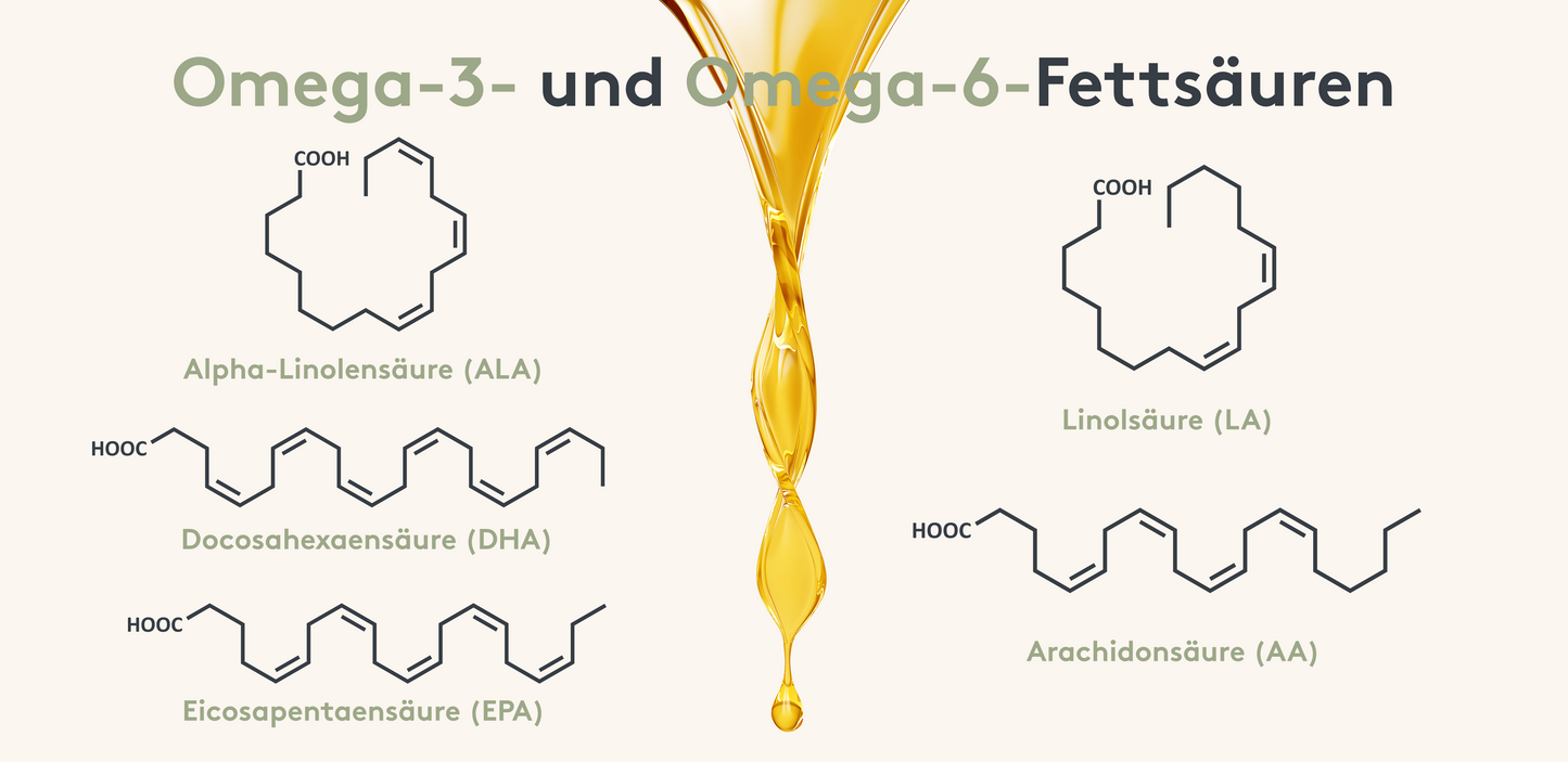 Zu den Omega-3-Fettsäuren gehören die essentielle Alpha-Linolensäure (ALA), Docosahexaensäure (DHA) und Eicosapentaensäure (EPA). ALA ist zum einen die Vorstufe von DHA und EPA und beeinflusst zum anderen die Flexibilität der Zellmembran, die wichtig für die Nährstoff- und Sauerstoffversorgung der Zellen ist.