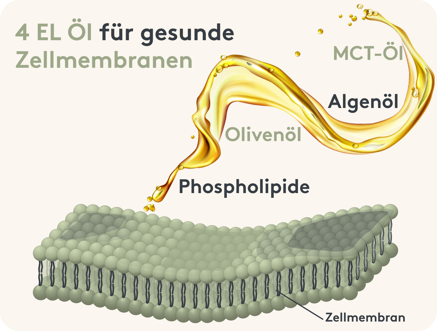Der Körper benötigt bestimmte Fettsäuren für den Aufbau der Zellmembranen, die je nach Zelltyp und -membran zu etwa 76 Prozent aus bunt gemischten Lipiden bestehen. Schon mit vier Esslöffeln Öl pro Tag kannst du deine Zellmembranen aktiv unterstützen.