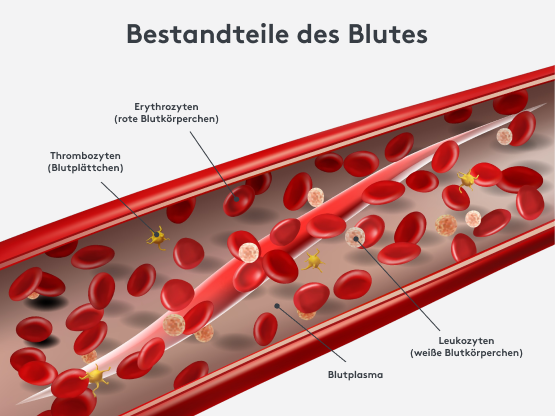 Das Blut besteht aus flüssigem Blutplasma, das Proteine wie Antikörper, Elektrolyte und Fibrinogen enthält, eine Vorstufe des für die Blutgerinnung relevanten Fibrin. Zum anderen bilden die folgenden Elemente den festen Blutbestandteil: