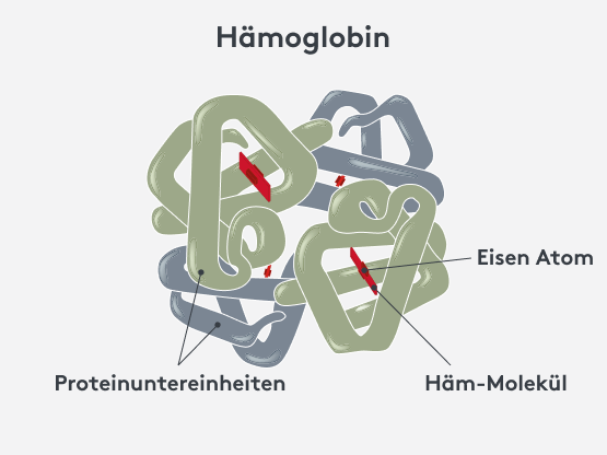 Das Protein Hämoglobin setzt sich aus vier Untereinheiten zusammen, die jeweils eine Häm-Gruppe enthalten. Diese Gruppen binden Sauerstoff- und Kohlenstoffdioxid-Moleküle. Was hat Eisen damit zu tun? Das Spurenelement hält die Häm-Gruppe zusammen und ermöglicht damit den lebenswichtigen Sauerstofftransport.
