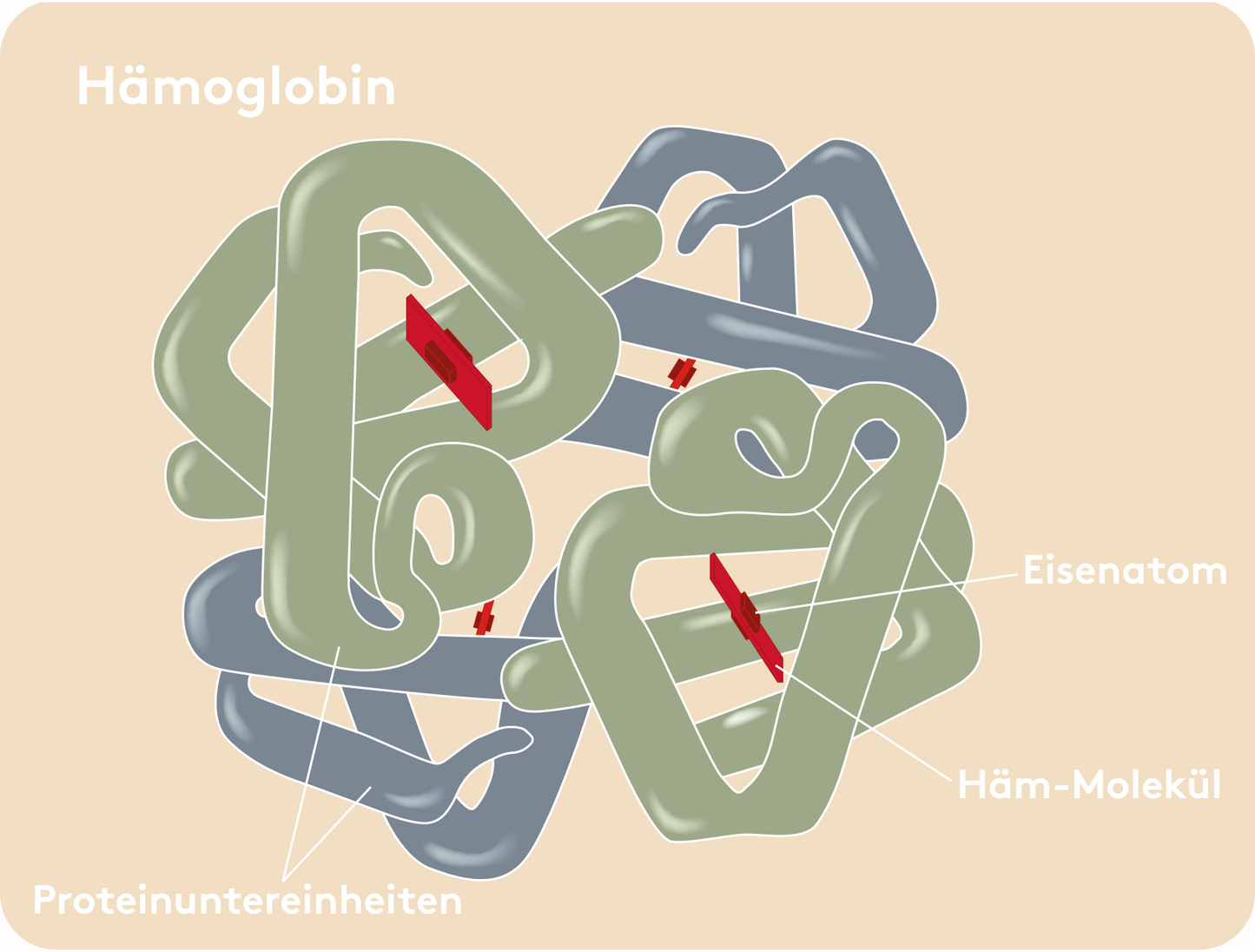 Das Protein Hämoglobin setzt sich aus vier Untereinheiten zusammen, die jeweils eine Häm-Gruppe enthalten. Diese Gruppen binden Sauerstoff- und Kohlenstoffdioxid-Moleküle. Was hat Eisen damit zu tun? Das Spurenelement hält die Häm-Gruppe zusammen und ermöglicht damit den lebenswichtigen Sauerstofftransport.
