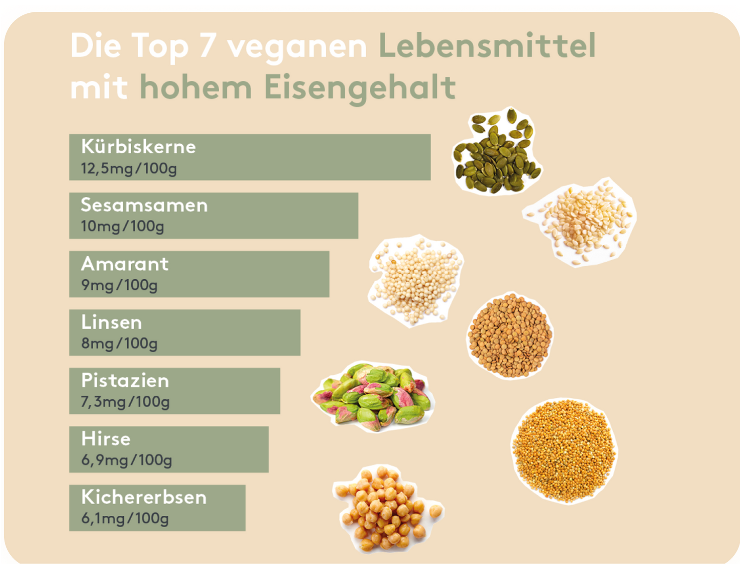 Ist deine Ernährung vegetarisch oder vegan, helfen dir Lebensmittel wie Samen, Kerne oder Hülsenfrüchte dabei, genug Eisen zu dir zu nehmen und deinen Eisenbedarf zu decken.