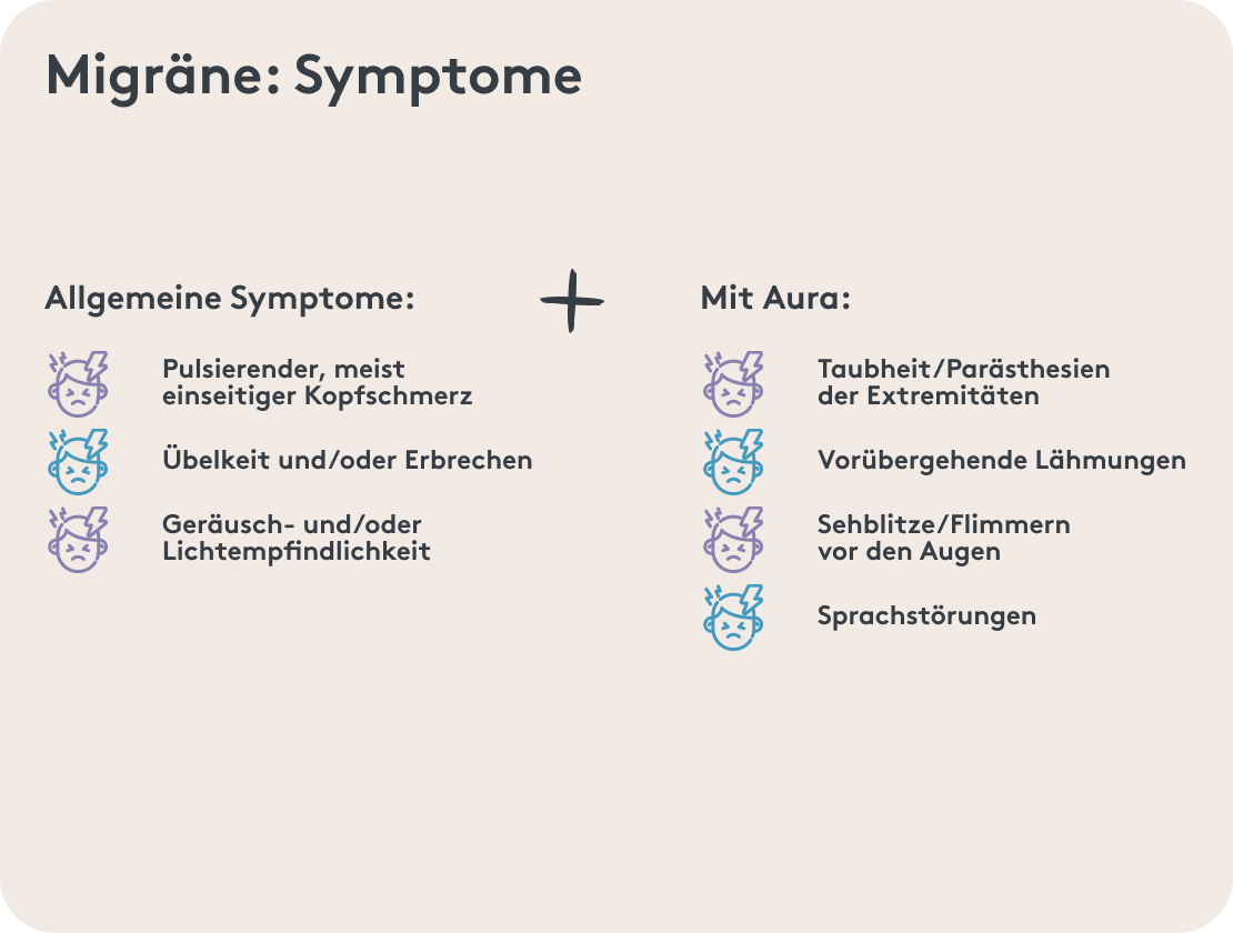 Bei Migräne unterscheidet man zwischen Migräne mit und ohne Aura. Die klassische Migräne ohne Aura zeigt sich neben Kopfschmerzen zusätzlich durch Übelkeit, Erbrechen, Geräuschempfindlichkeit und Lichtempfindlichkeit. Nicht bei allen Personen müssen jedoch alle Symptome auftreten.