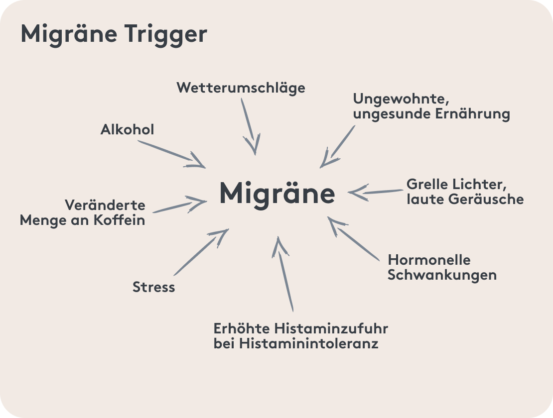 Häufige Trigger sind Schlafmangel, Stress, ein veränderter Koffeinkonsum, ungesunde Ernährung, grelle Lichter, laute Geräusche, Wetterumschläge und hormonelle Veränderungen, zum Beispiel im Falle der menstruellen Migräne. Bei histaminsensitiven Personen mit Migräne kann auch eine vermehrte Histaminzufuhr einen Migräneanfall auslösen. Ähnlich verhält es sich mit Glutamat, Aspartat und Nitrit.