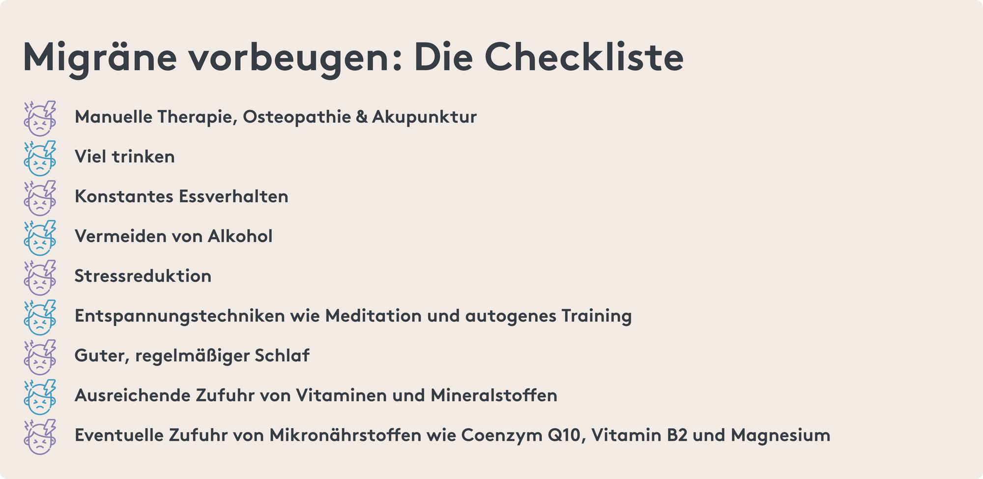 In jedem Fall kann es hilfreich sein, auf ganzheitliche und nicht-medikamentöse Methoden wie Nahrungsergänzung, Osteopathie oder Akupunktur zurückzugreifen und so einer Migräneattacke möglichst ganzheitlich zu begegnen und den eigenen Körper zu unterstützen.