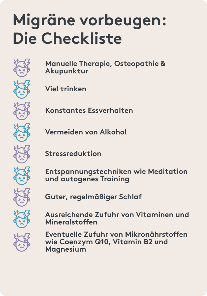 Das wohl Einfachste, was du unternehmen kannst, ist das Führen eines Migräne-Tagebuchs. Dies gibt Hinweise auf potenzielle Trigger, die du fortan meiden solltest, um Migräneattacken zu verhindern. Weiterhin ist es grundsätzlich förderlich, Stress möglichst zu meiden und eine konstante Ernährungsweise zu verfolgen.