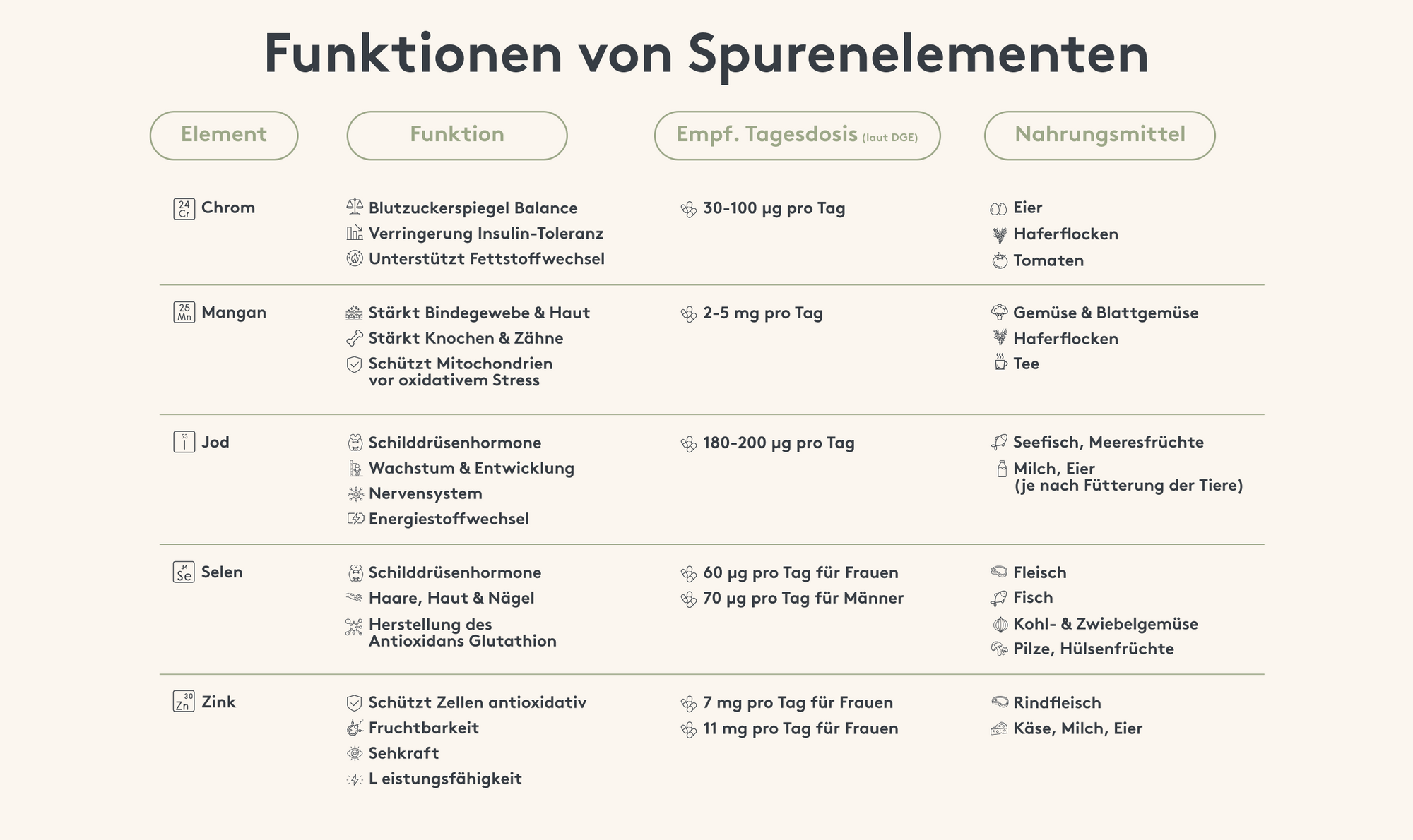Diese Substanzen sind wichtige Helfer für Enzyme und Hormone (Cofaktoren) und unterstützen deinen Stoffwechsel. Sie sind zum Bespiel am Kohlenhydratstoffwechsel und am Aufbau von Knochen und Zähnen beteiligt, transportieren Sauerstoff durch deine Blutbahnen oder unterstützen die Wundheilung.
