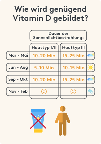 Gerade in unseren Breitengraden ist der Winkel der Sonneneinstrahlung allerdings recht gering - selbst im Sommer. Um hierzulande laut der DGE (Deutsche Gesellschaft für Ernährung) genügend Vitamin D zu bilden, sollte man als hellhäutige Person mittags (zwischen 12 und 15 Uhr) im Sommer 10 Minuten in der Sonne stehen, wobei ein Viertel der Körperoberfläche unbedeckt bleiben muss. Im Frühling und frühen Herbst sind es bis zu 20 Minuten. Als dunkelhäutige Person ist die Zeit verlängert, da die Sonnenstrahlen nicht so gut durch die Haut gelangen. Im späten Herbst und Winter ist eine Abdeckung des Tagesbedarfs über die Sonneneinstrahlung gar nicht möglich, da diese nicht stark genug ist6.