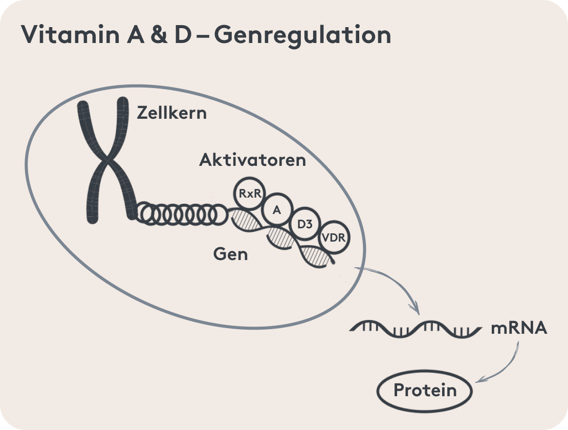 Früher vor allem mit der Sehfunktion assoziiert, wissen wir heute, dass Vitamin A noch deutlich mehr Funktionen besitzt. Zusammen mit, unter anderem, Vitamin D hat es auch in der Genregulation seine Finger im Spiel. Über seinen Rezeptor kann es Gene aktivieren, die zum Beispiel Einfluss auf das Immunsystem, Wachstum und den Knochenhaushalt haben.