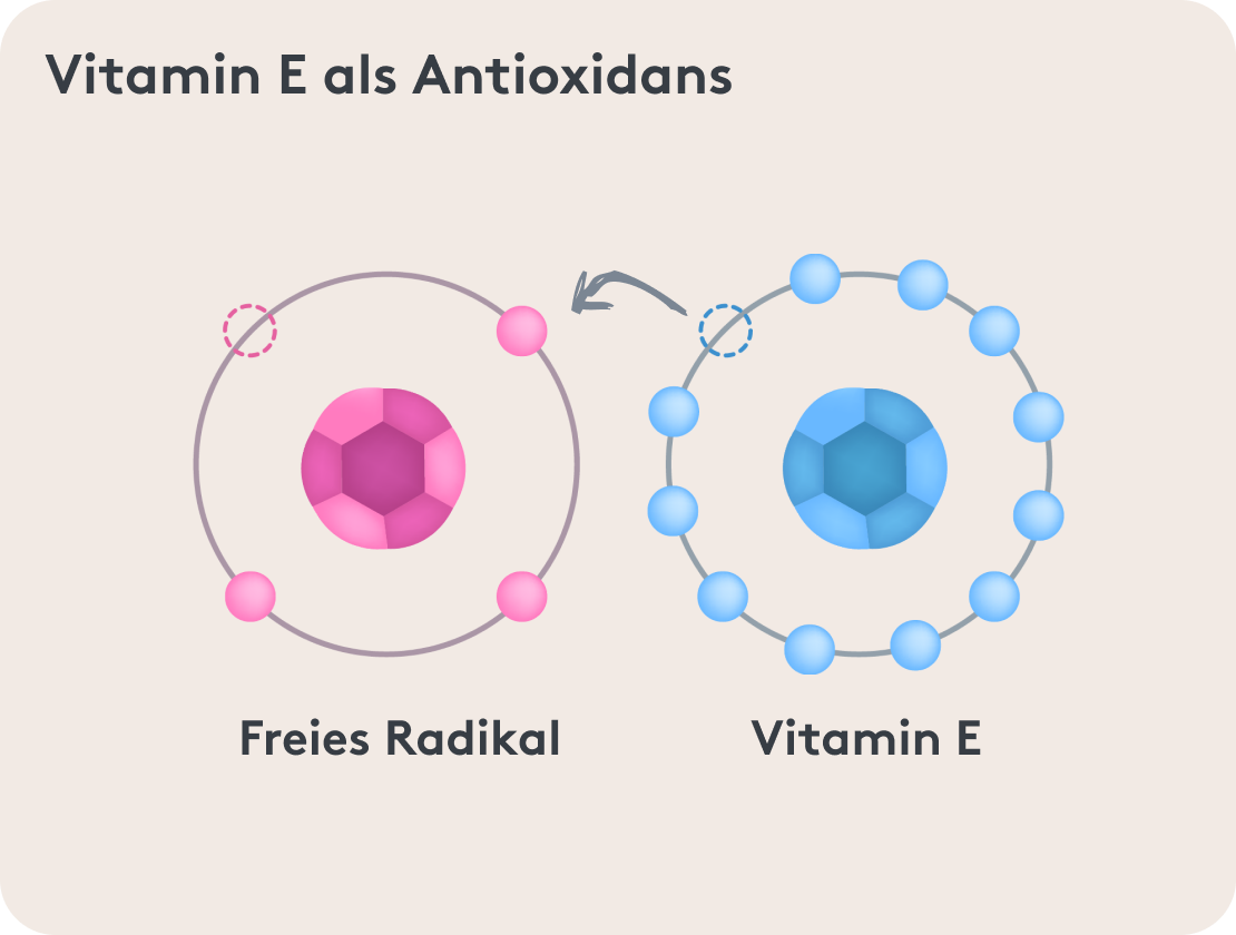 Vitamin E, auch Tocopherol genannt, ist unter anderem wichtig für den Schutz der Körperzellen vor freien Radikalen. Vitamin E ist ein starkes Antioxidans. Das bedeutet, es schützt vor oxidativem Stress. Hierbei ist Vitamin E eines der wenigen fettlöslichen Antioxidantien. Außerdem ist Vitamin E am Fettstoffwechsel beteiligt.
