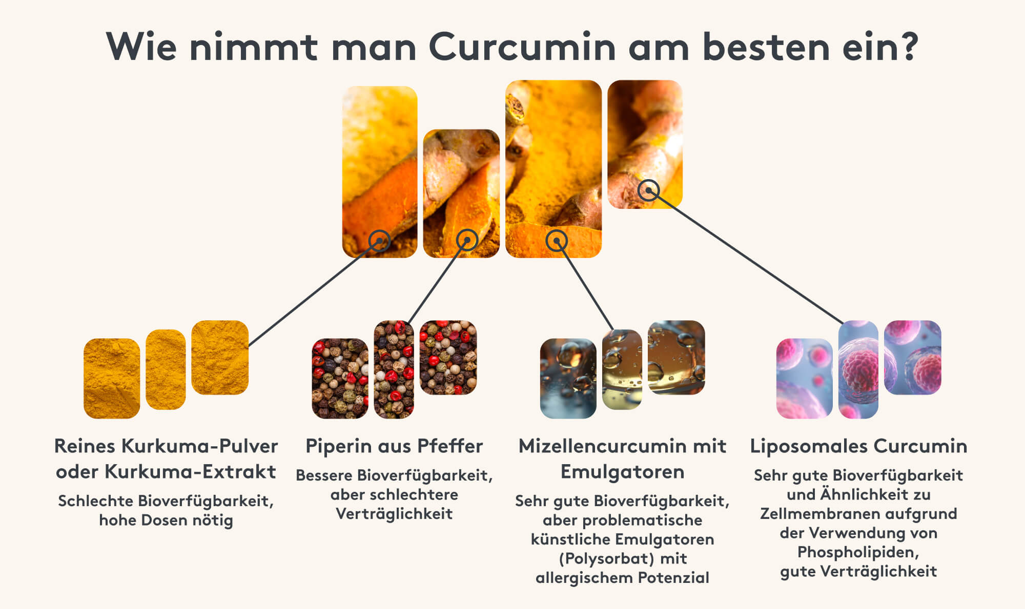 Kommen wir endlich zur Frage aller Fragen: "Wie nehme ich Kurkuma bzw. Curcumin am besten ein?" Tatsächlich gibt es ganz unterschiedliche Einnahmen, die sich in ihrer Aufnahmefähigkeit auch stark unterscheiden. Wusstest du, dass der Wirkstoff Curcumin normalerweise schlecht wasserlöslich und nicht sonderlich stabil ist und daher normalerweise fast gar nichts aufgenommen wird9. Vor dieses Problem sah sich die Forschung gestellt und versuchte, diese Bioverfügbarkeit zu verbessern – zum Beispiel mit Piperin, Mizellen oder Liposomen. Aber wie kann Curcumin denn nun am besten aufgenommen werden?