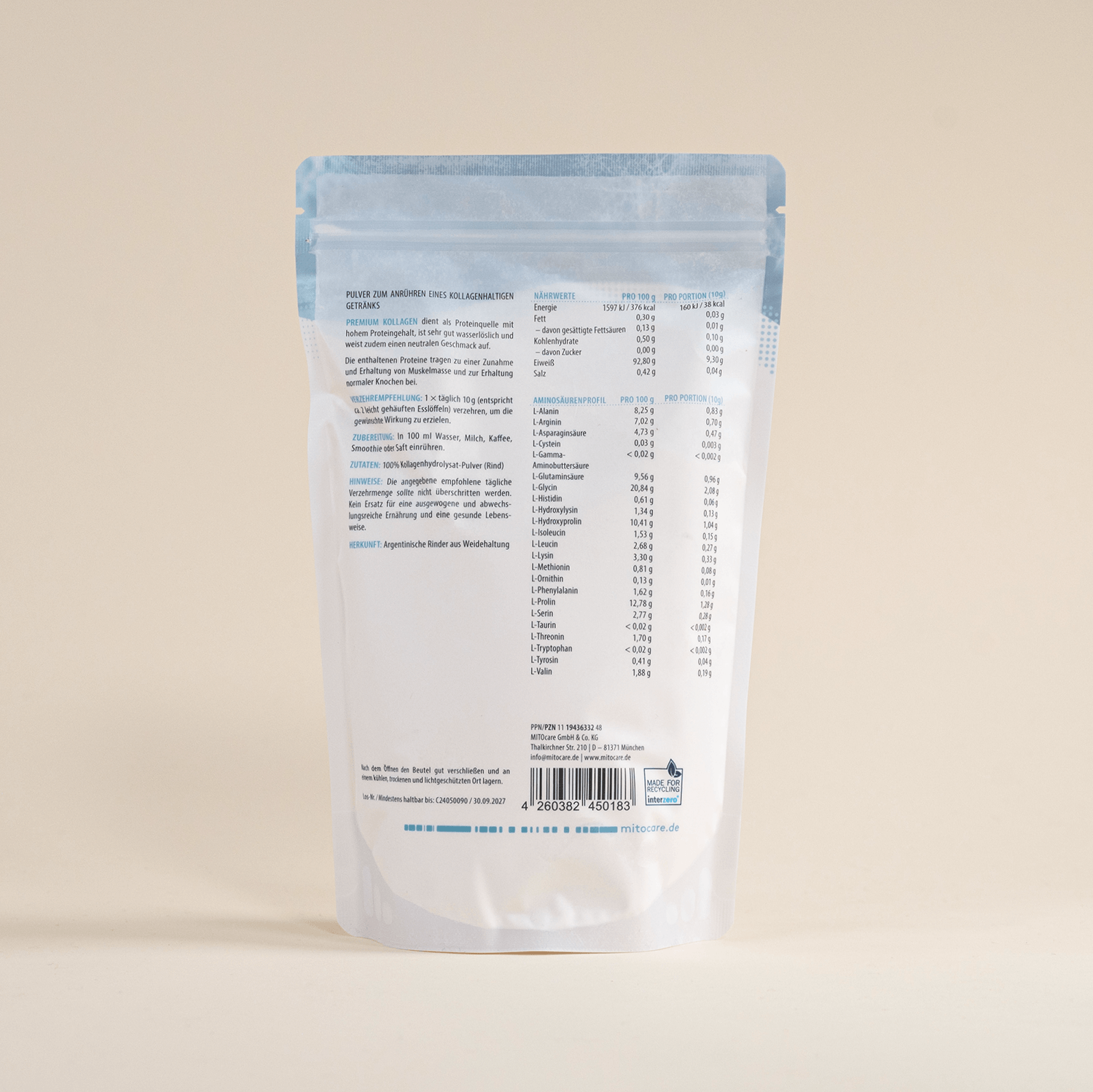 Zutaten: 100% Rinderkollagenhydrolysat-Pulver (von Rindern aus argentinischer Weidehaltung)