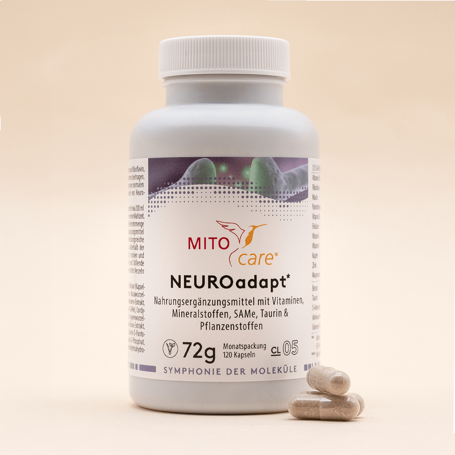 Das Produkt NEUROadapt wurde speziell für eine ausgeglichene Psyche1 und gesunde kognitive Funktionen3 wie Wahrnehmung, Erkenntnis- und Informationsverarbeitung, Motivation und Stimmung entwickelt. Der Einsatz der bioverfügbaren Formen von Vitamin B6, Vitamin B12, Vitamin C, Niacin, Kupfer und Riboflavin tragen zur Funktion des im Gehirn- und Rückenmark sitzenden Nervensystems sowie der Nervenzellen und Nervenbahnen bei.5 Die im Produkt enthaltene Pantothensäure trägt zu einem ausgeglichenen Stoffwechsel von Steroidhormonen wie z.B. Cortisol bei. Auch die Synthese diverser Neurotransmitter wird unterstützt4 mit dem Ziel, die ordnungsgemäße Reizübertragung zwischen Gehirn und Körperfunktionen zu gewährleisten. Neurotransmitter bestehen oft aus Aminosäuren oder deren Derivaten, daher enthält das Produkt NEUROadapt ebenso die hoch bioverfügbare Folsäure als Methyltetrahydrofolat zur Unterstützung der Aminosäuresynthese.6 Über 10 zusätzliche Pflanzenstoffe sowie der Stoff S-Adenosylmethionin (SAMe) runden diese reichhaltige Formulierung ab.
