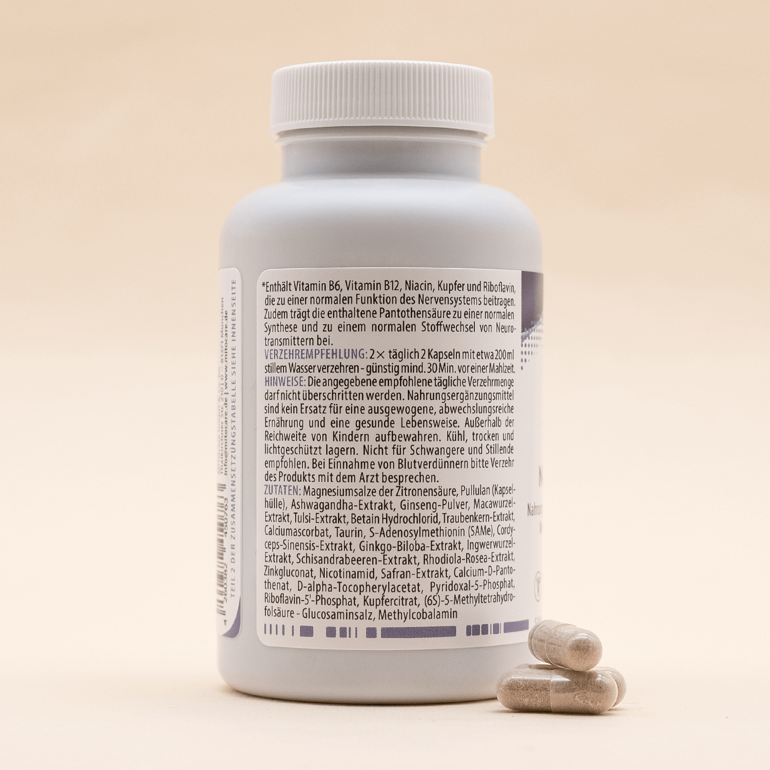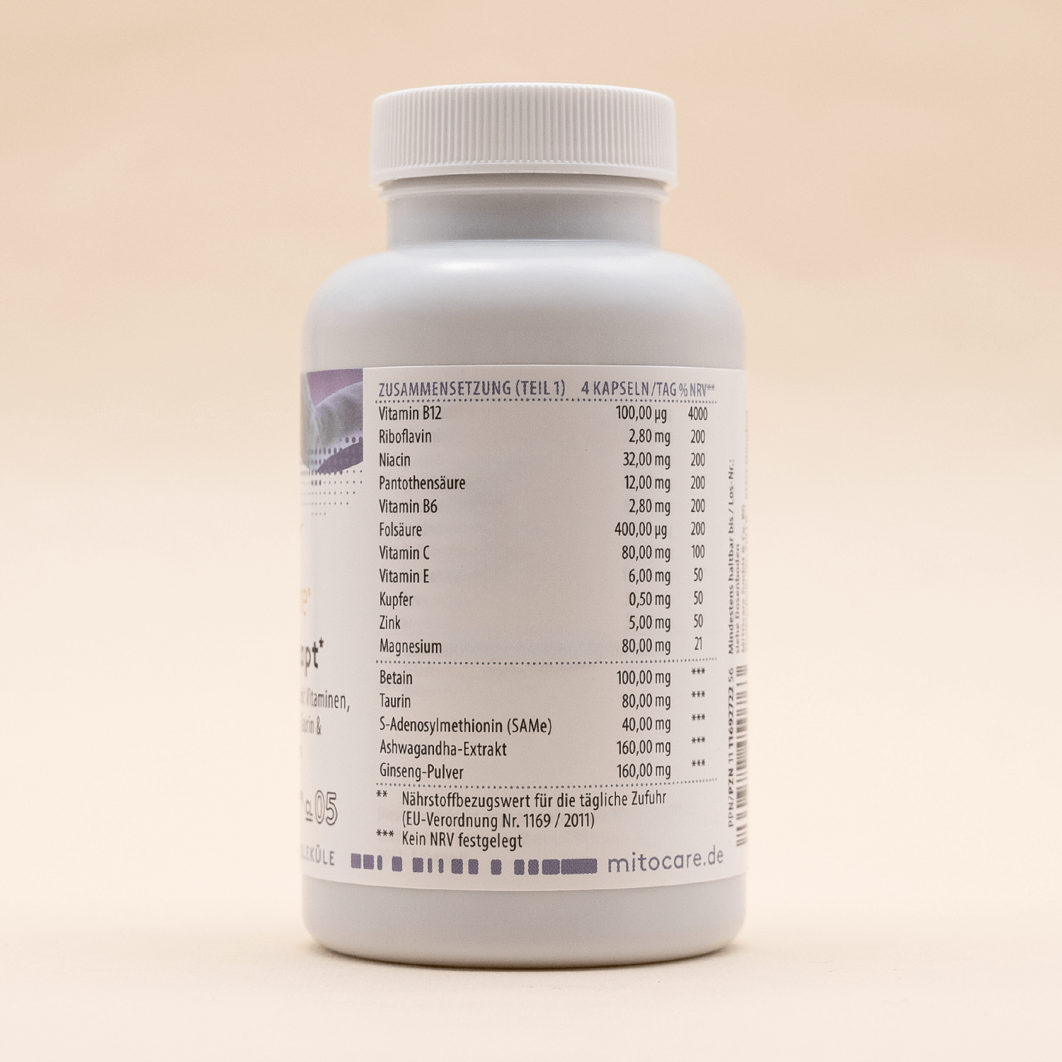 Zutaten: Magnesiumsalze der Zitronensäure, Pullulan (Kapselhülle, Gr.0), Ashwagandha-Extrakt, Ginseng-Pulver, Macawurzel-Extrakt, Tulsi-Extrakt, Betain Hydrochlorid, Traubenkern-Extrakt, Calciumascorbat, Taurin, S-Adenosylmethionin (SAMe), Cordyceps-Sinensis-Extrakt, Ginkgo-Biloba-Extrakt, Ingwerwurzel-Extrakt, Schisandrabeeren-Extrakt, Rhodiola-Rosea-Extrakt, Zinkgluconat, Nicotinamid (Vitamin B3), Safran-Extrakt, Calcium-D-Pantothenat, D-alpha-Tocopherylacetat (Vitamin E), Pyridoxal-5-Phosphat (Vitamin B6), Riboflavin-5-Phosphat (Vitamin B2), Kupfercitrat, (6S)-5-Methyltetrahydrofolsäure - Glucosaminsalz, Methylcobalamin (Vitamin B12)