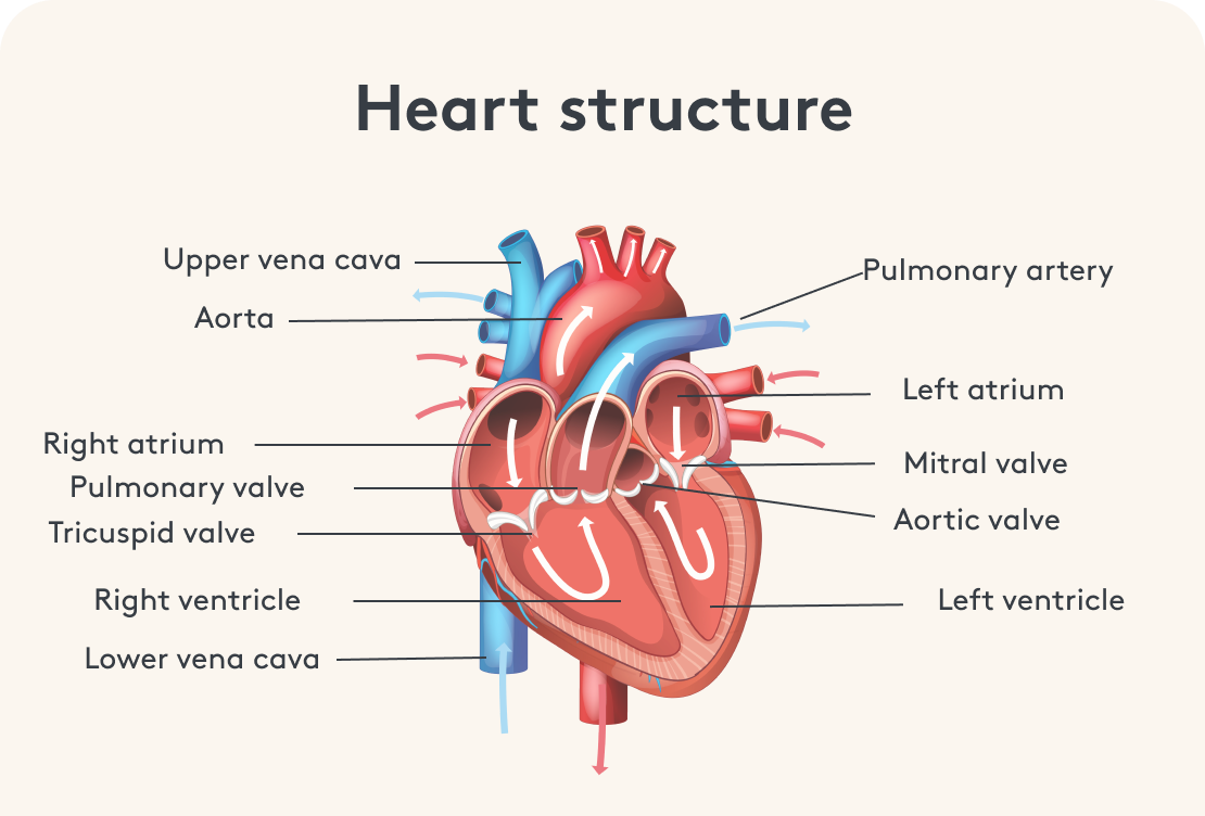 The heart consists of two atria at the top and two ventricles at the bottom. The right side of the heart receives deoxygenated blood from the body and pumps it to the lungs, where it is enriched with fresh oxygen. The left side receives the oxygen-rich blood and sends it throughout the body via the main artery (aorta).