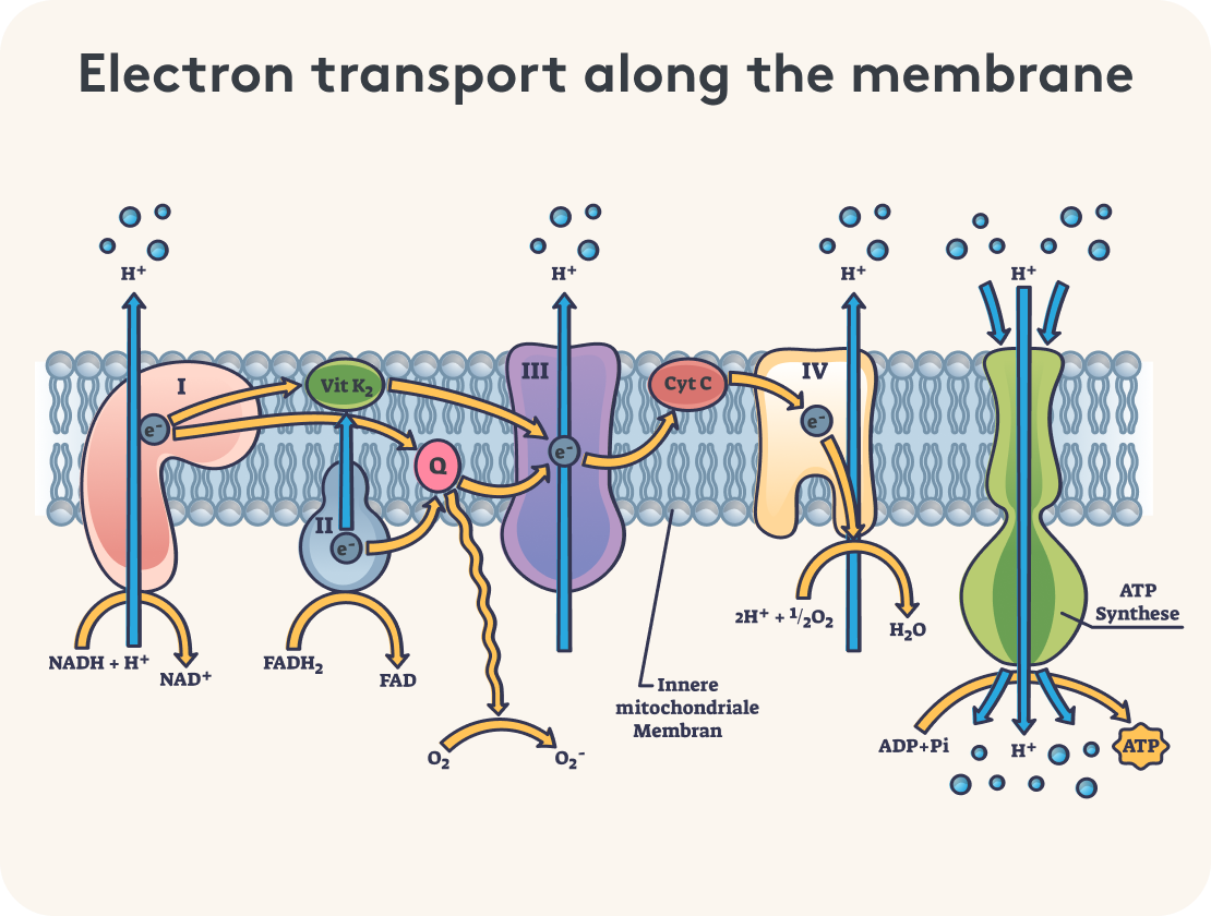The respiratory chain is a process within the mitochondria in which a large amount of energy can be produced. Energy production works as follows: electrons are transported from molecule to molecule and through various processes so much energy is ultimately available that the body has enough material to produce the universal energy carrier ATP.