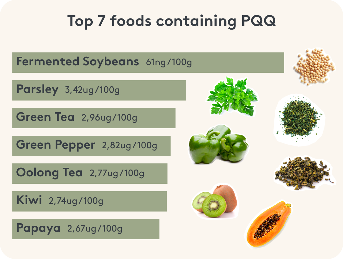 Infants receive their daily dose of PQQ from breast milk . Later, food must be sufficient as a source of PQQ. Foods that contain relatively high levels of the substance include: