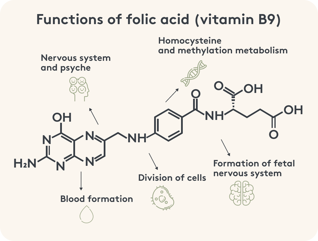 Der Nährstoffbedarf bei Schwangeren und Stillenden ist erhöht – schließlich versorgt ihr Körper das Kind mit. Insbesondere in den ersten Schwangerschaftswochen ist Vitamin B9 (Folsäure) hierbei von großer Bedeutung, da dieses Vitamin an der Zellteilung beteiligt ist und zu einer gesunden Entwicklung des Babys beiträgt. Auch bei bestehendem Kinderwunsch solltest du auf eine ausreichende Versorgung mit Folsäure achten. Weitere wichtige Schwangerschaftsvitamine sind u. a. Vitamin A, Vitamin B6, Vitamin C und Vitamin D.²²