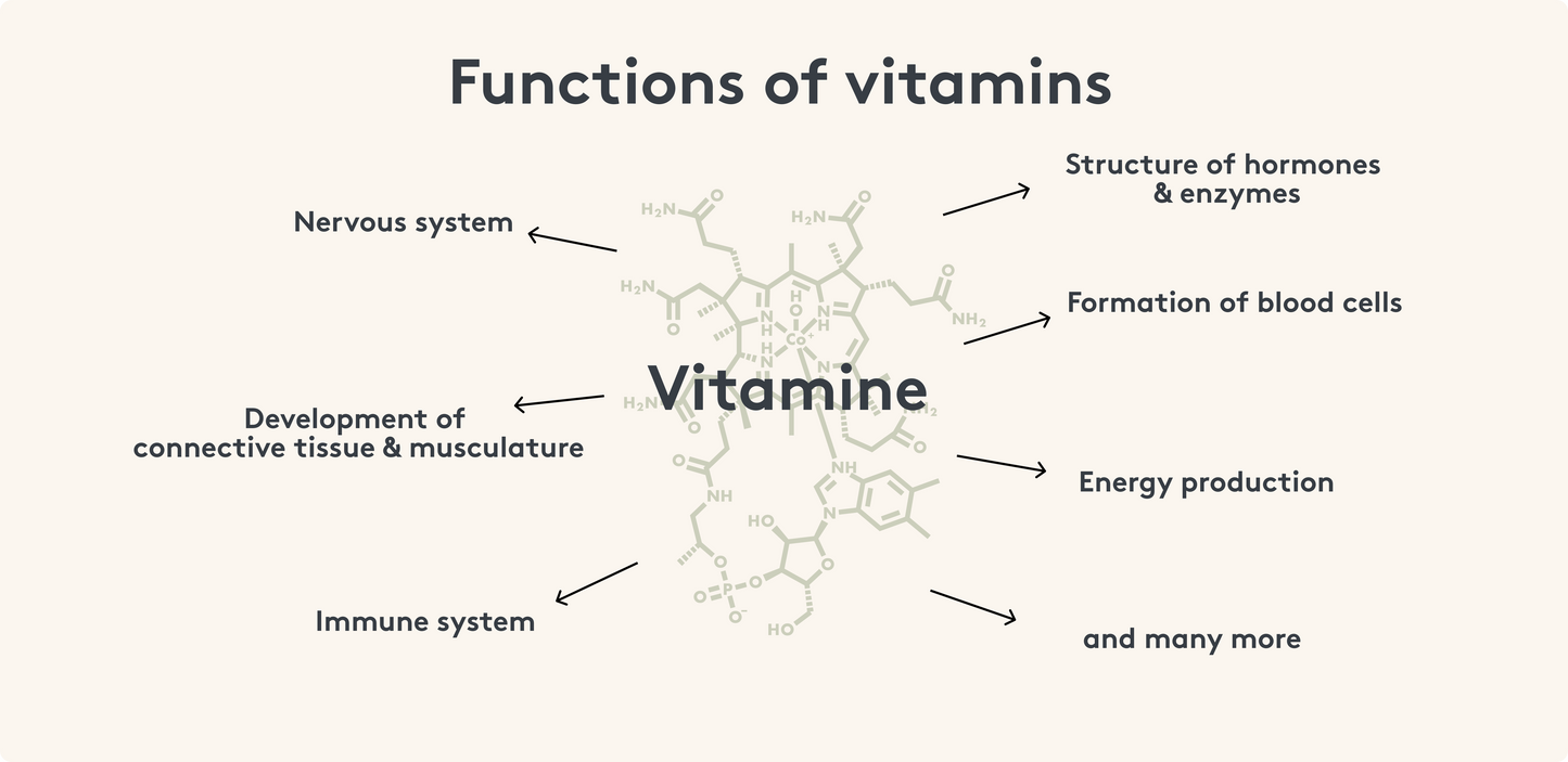 Obwohl Vitamine keine Energie liefern, ist der Mensch ohne diese weder leistungs- noch lebensfähig. Alle Vitamine erfüllen wichtige Aufgaben im menschlichen Körper. So helfen sie bei der Verwertung der Nahrung, sie sind beteiligt am Aufbau von Hormonen, Enzymen und Blutkörperchen, schützen vor Schadstoffen und steuern zahlreiche biochemische Prozesse im Körper.