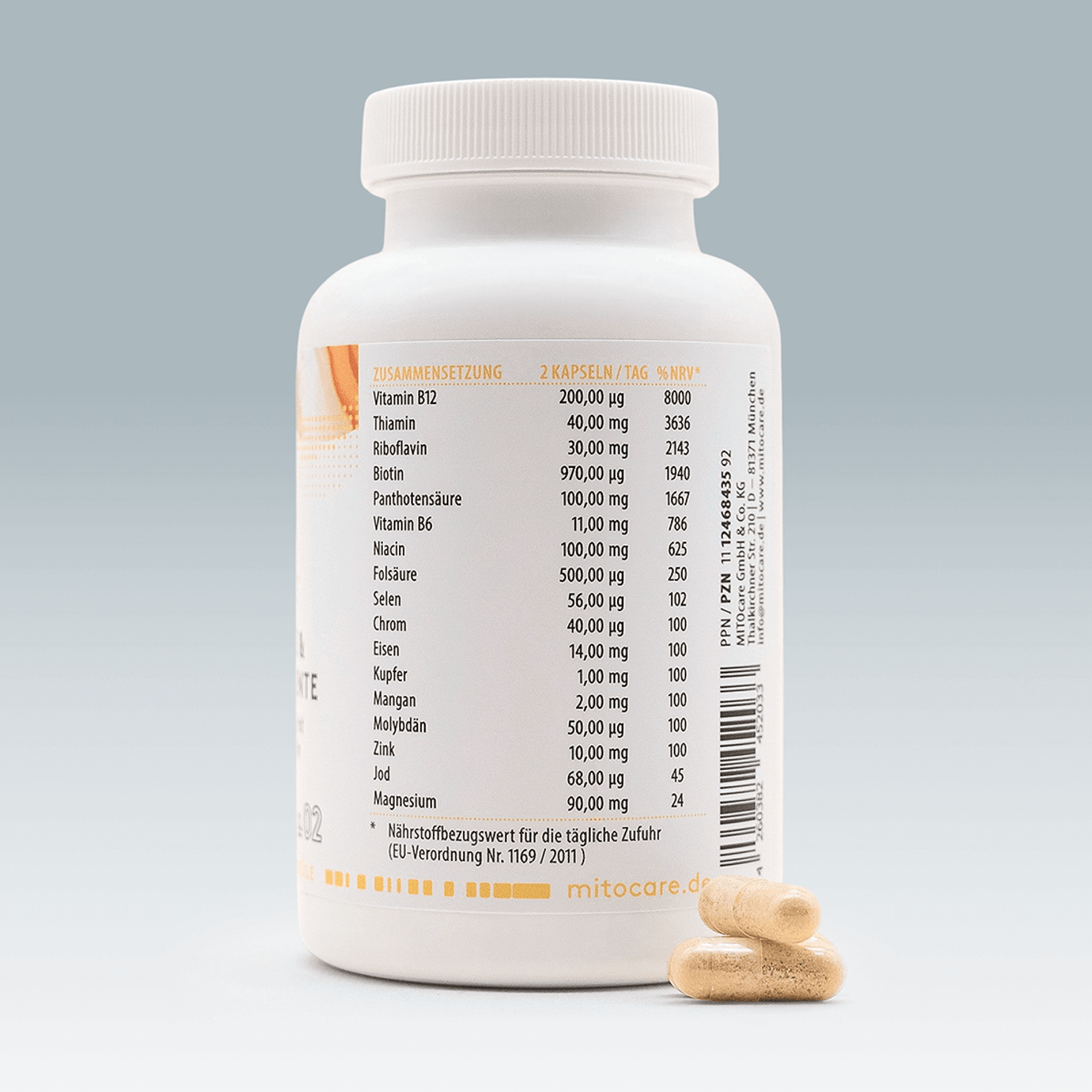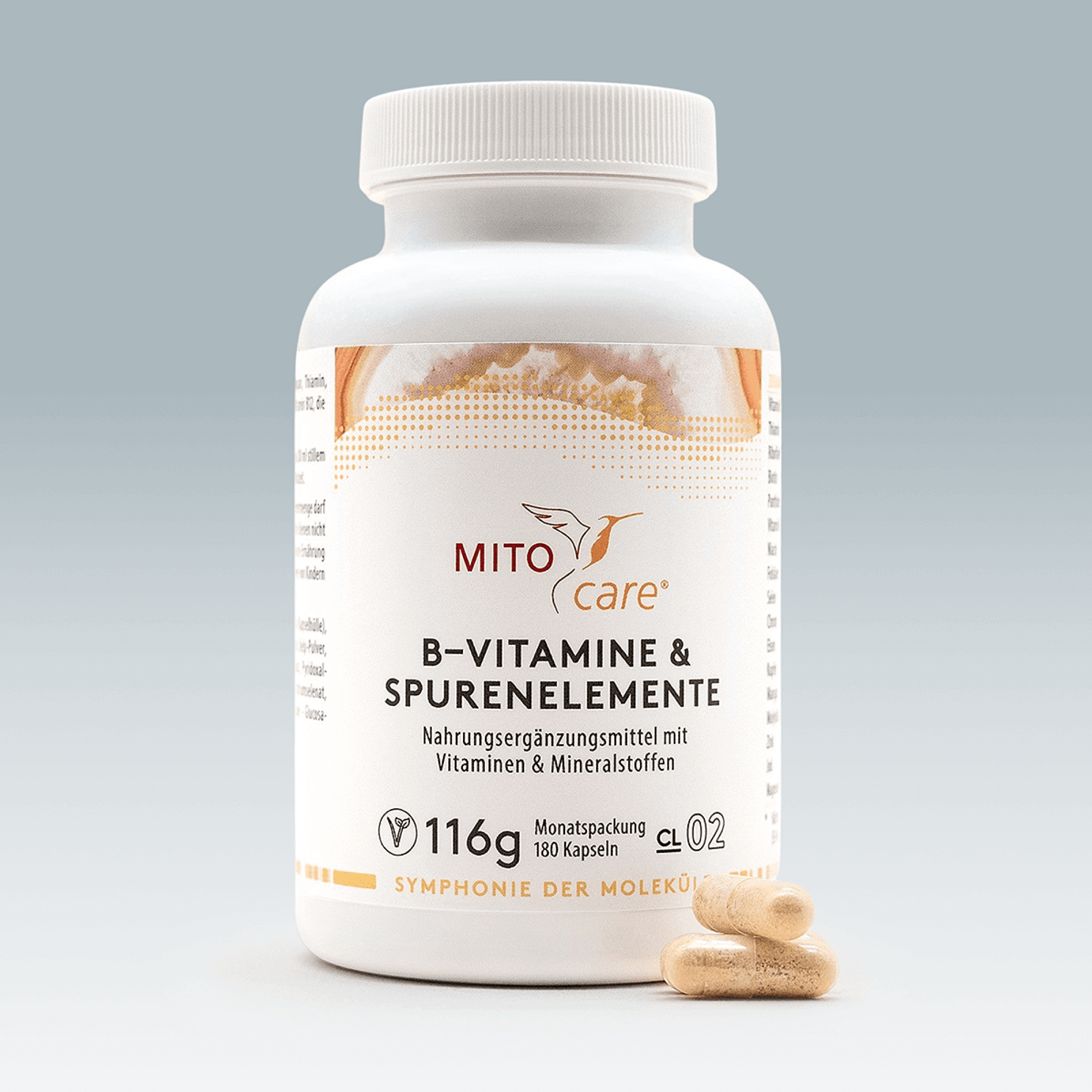 Our B vitamins & trace elements product contains all B vitamins in bioactive form. Depending on the type, the functions of the B vitamins range from involvement in energy metabolism1 to supporting the nervous2 and immune systems4 and the psyche3. They also contain the eight essential trace elements chromium, iron, iodine, copper, manganese, molybdenum, selenium and zinc, each of which is essential for certain processes in the body. For example, iodine and selenium are required for healthy thyroid function9, manganese and copper for the formation and maintenance of intact connective tissue7,8 and zinc for the maintenance of healthy skin5 and hair6. The mineral magnesium rounds off this product.
