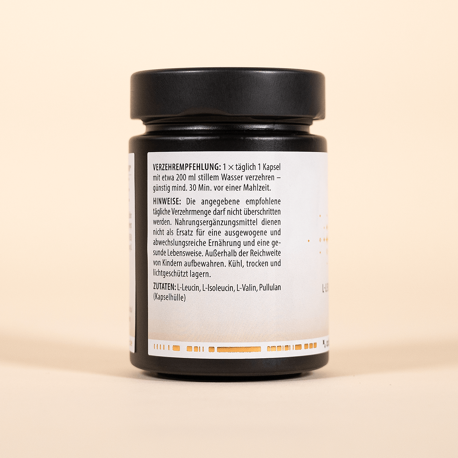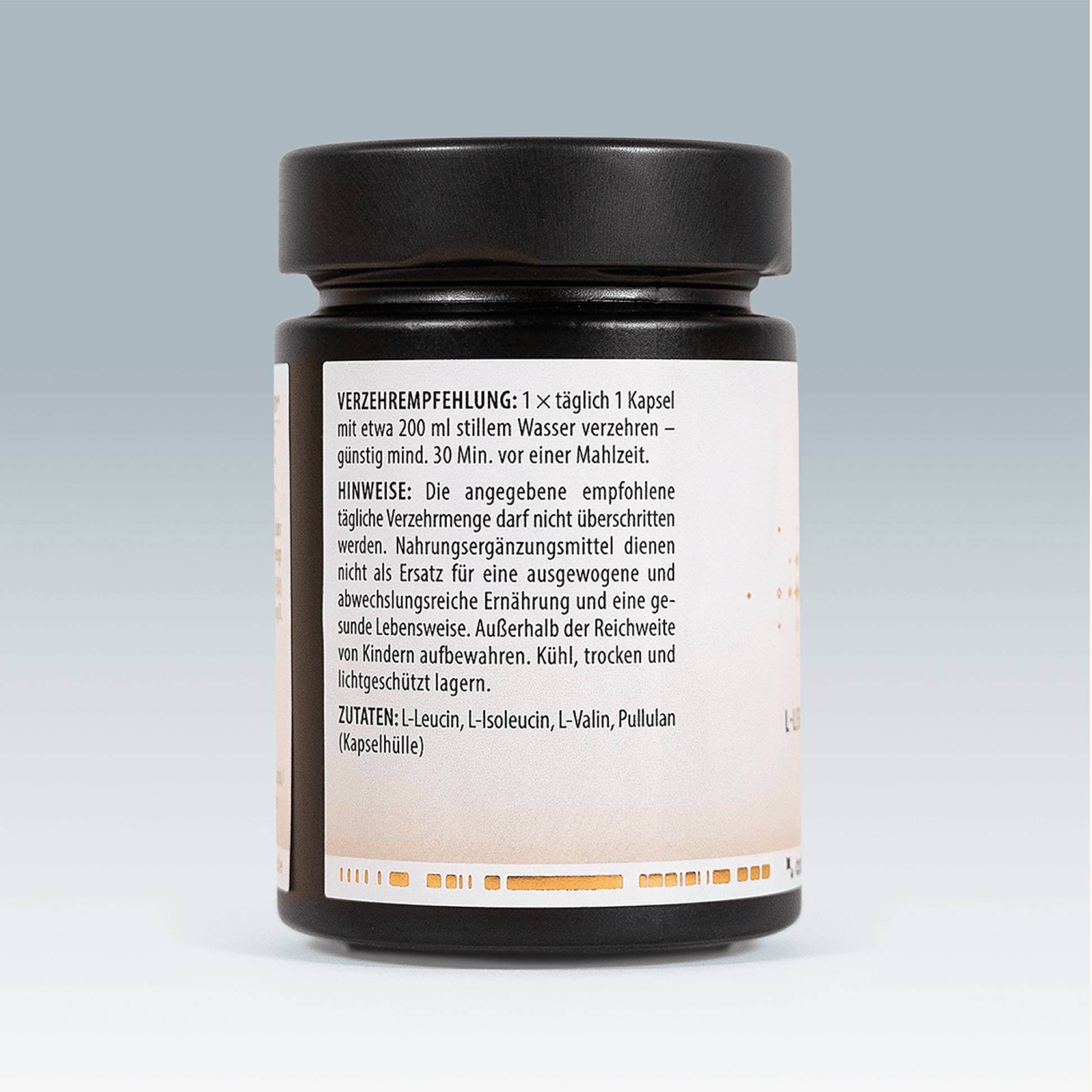 L-leucine, L-isoleucine, L-valine, pullulan (capsule shell size 00)