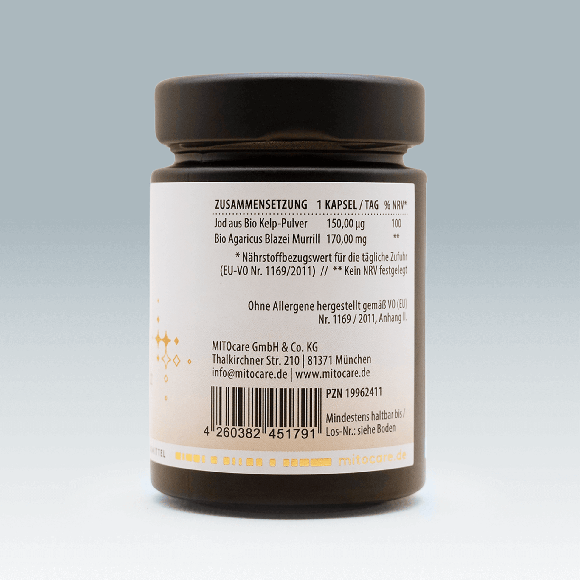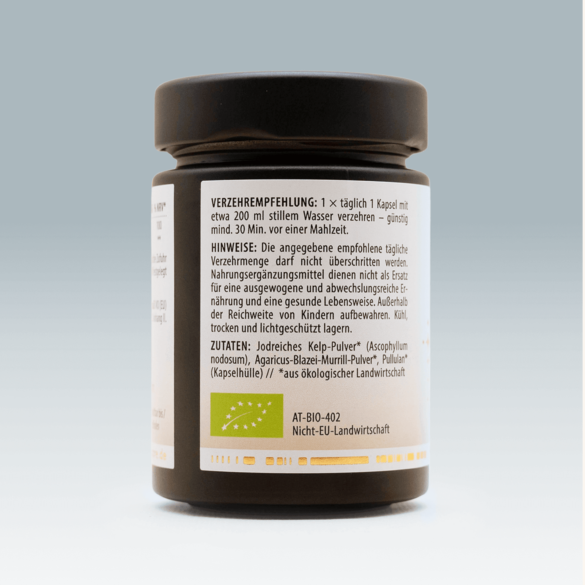 Zutaten: Jodreiches Kelp-Pulver* (Ascophyllum nodosum), Agaricus-Blazei-Murrill-Pulver*, Pullulan* (Kapselhüle)
