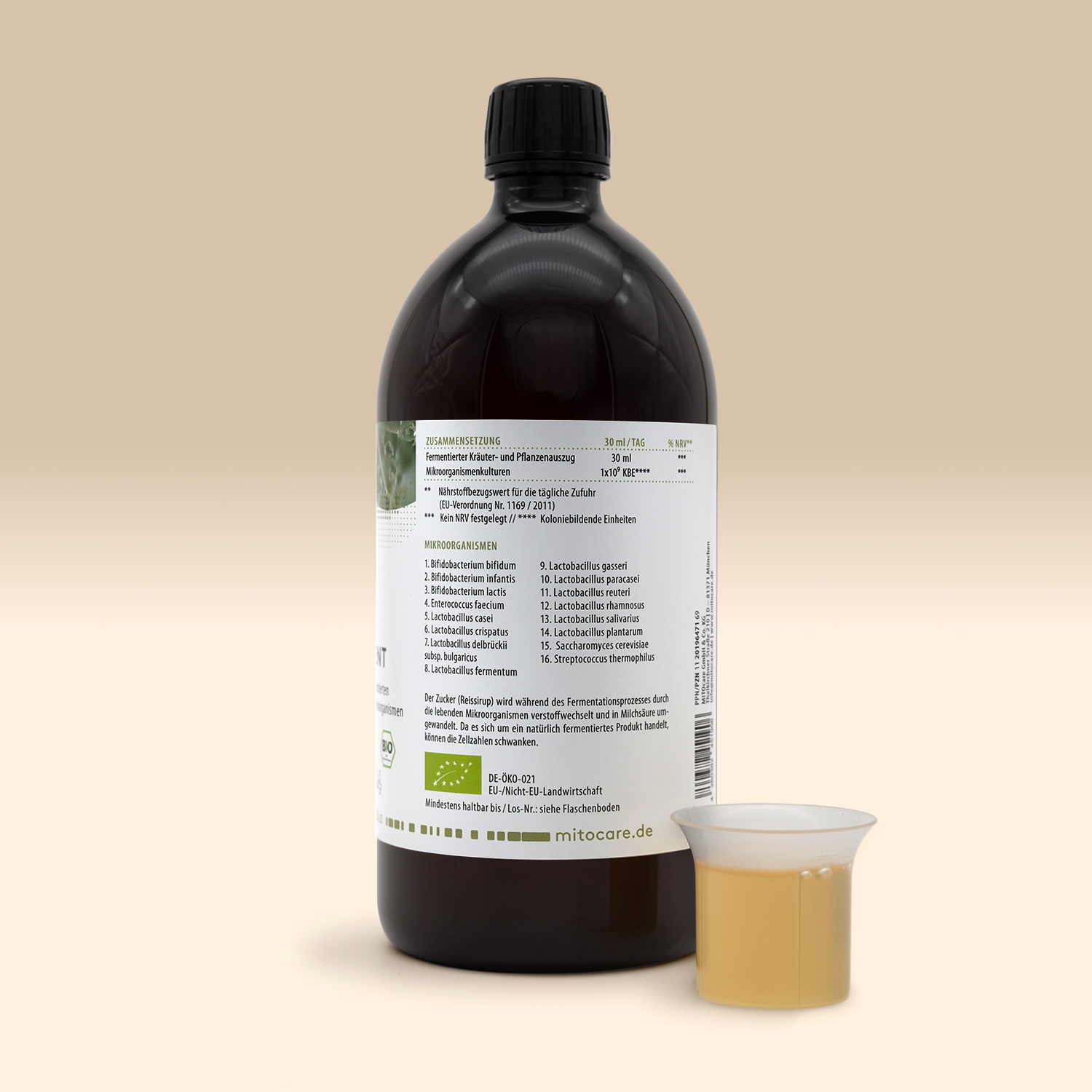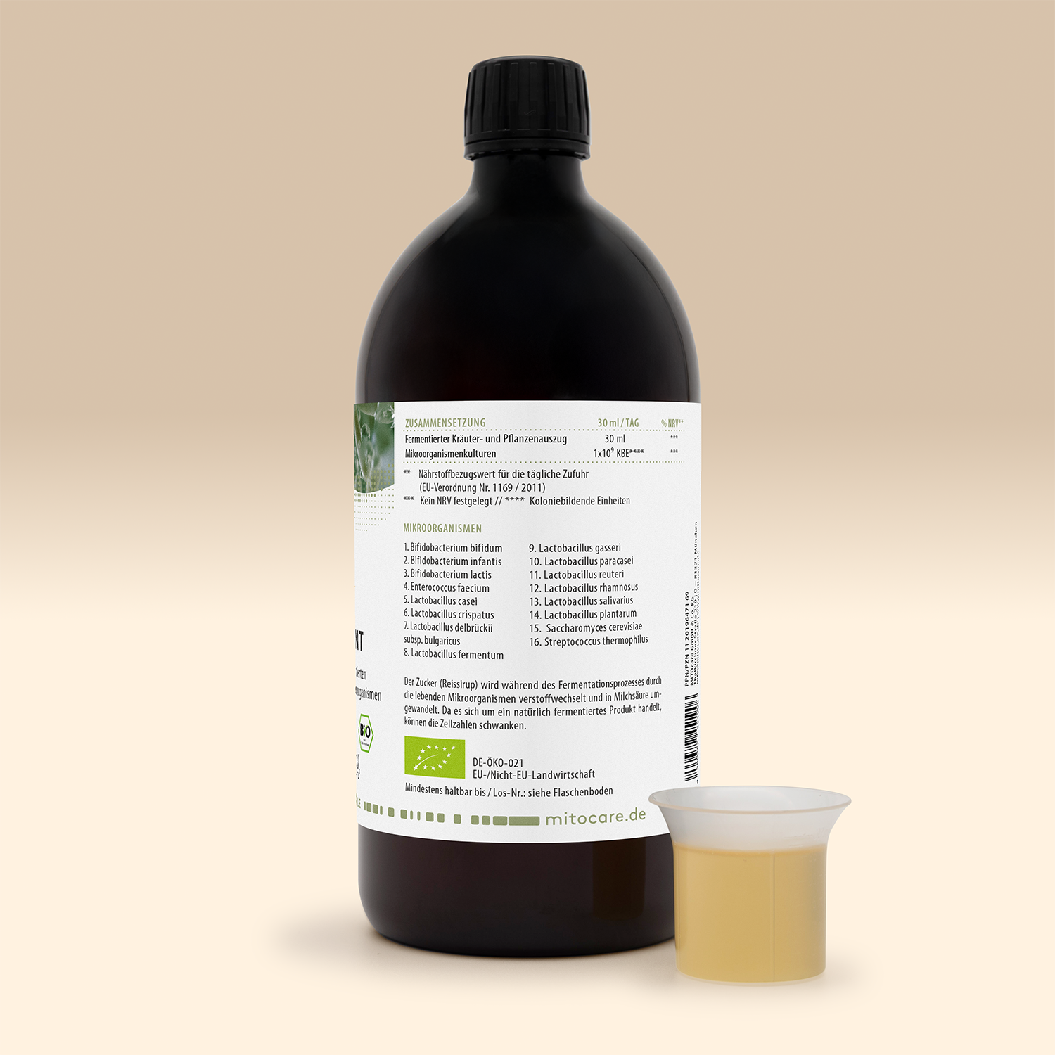 Our organically grown Bitterferment is produced through the multi-stage fermentation of valuable, natural bitter herbs in combination with a special microorganism profile. The result is a balanced interplay of certified organic bitter herbs, such as artichokes, gentian root, and wormwood, and 16 different resilient, live cultures in a stable environment. Various lactobacilli and bifidobacteria, as well as other microorganisms like Saccharomyces cerevisiae and Streptococcus thermophilus, are used in the process. Production relies exclusively on whole plant parts, and the absence of sterilization preserves the pure, raw food quality.
