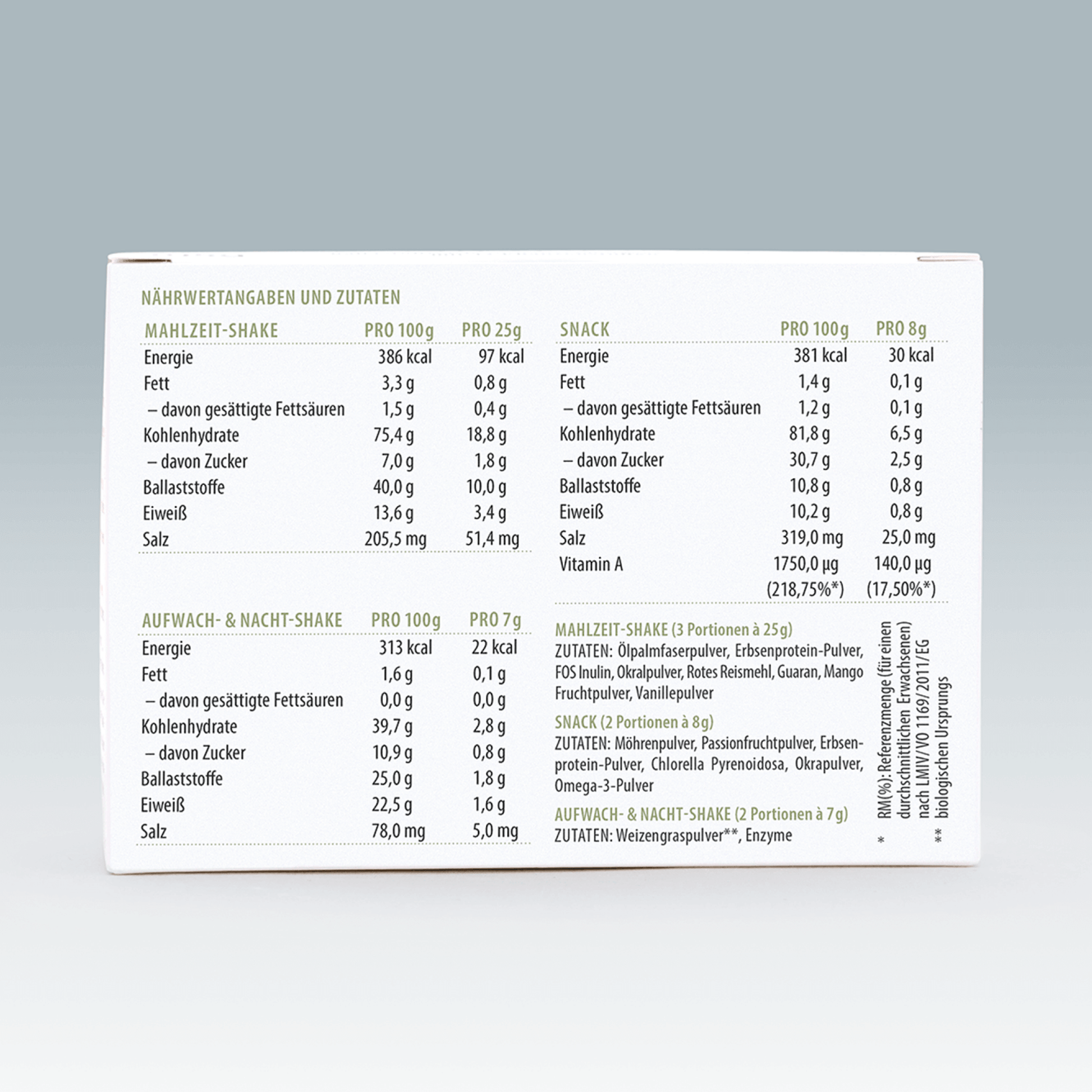 Our product Gut Friend is a powdered drink mix for one day, consisting of three different compositions for seven shakes. It has a high fibre content and contains 12 botanicals plus vitamin A, which supports the immune system2 and healthy mucous membranes, including those of the intestine1. Consumption over four days is recommended.