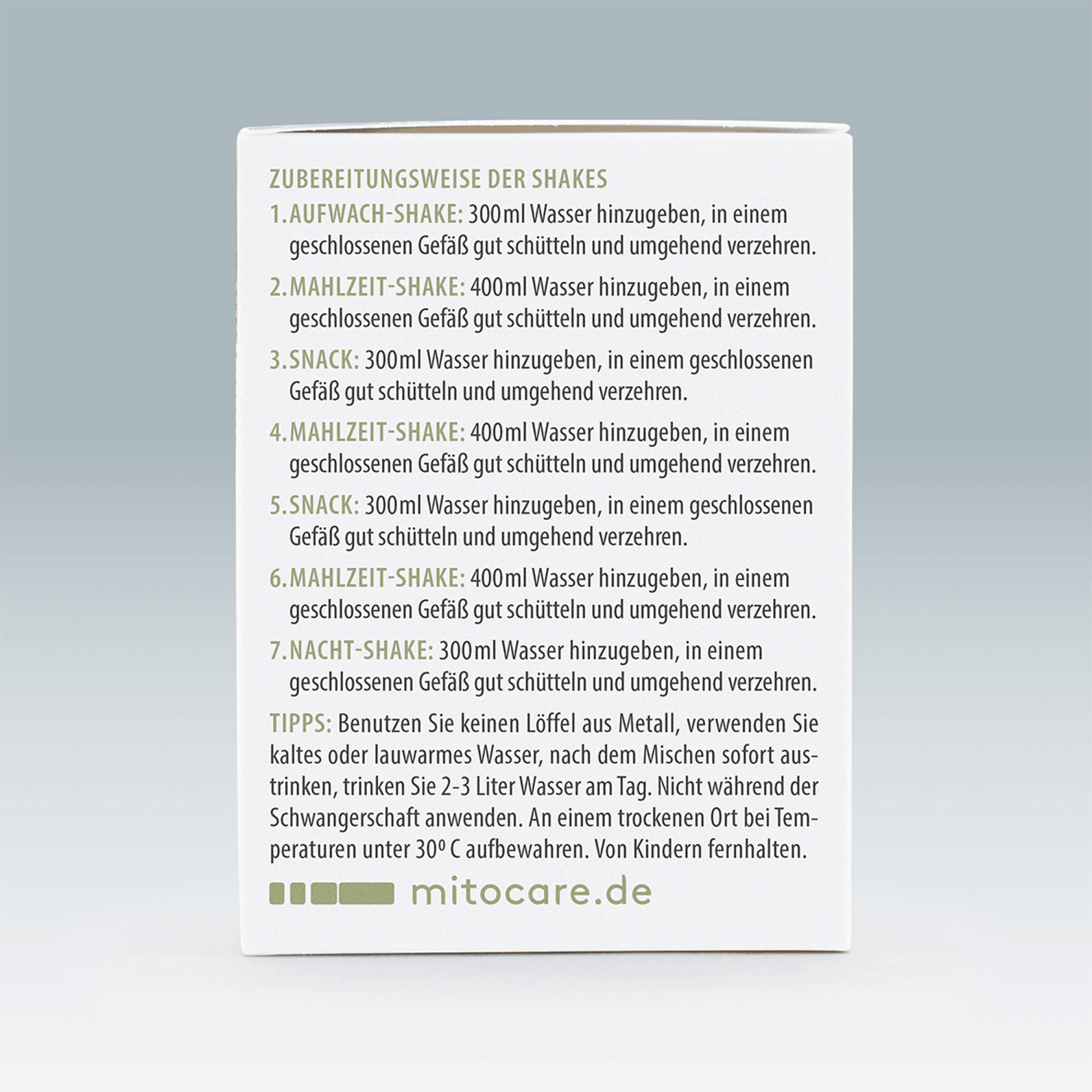 - • Tip 1: Consume the shakes immediately after mixing - plus at least 2 liters of water per day. No coffee or alcohol should be consumed during consumption.
