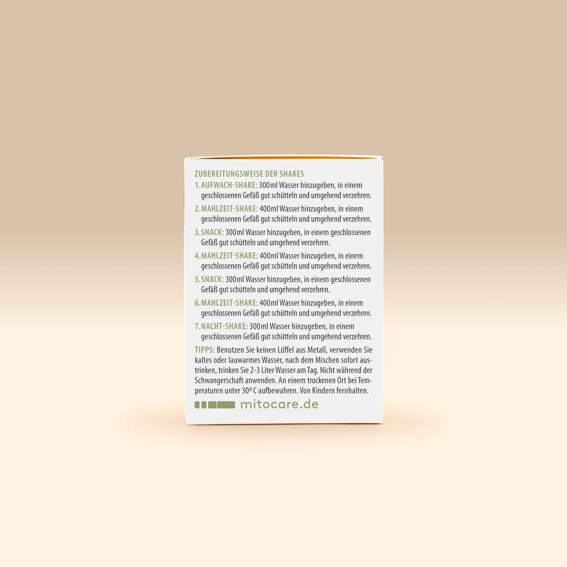 - • Tip 1: Consume the shakes immediately after mixing - plus at least 2 liters of water per day. No coffee or alcohol should be consumed during consumption.