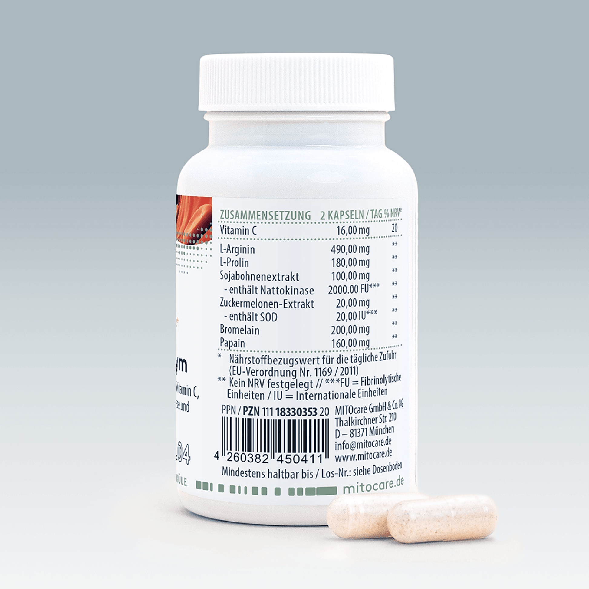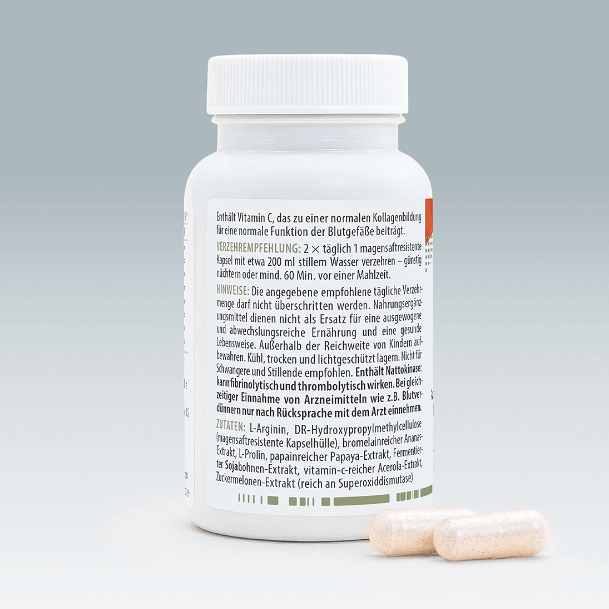 Ingredients: L-arginine, DR-hydroxypropyl methylcellulose (capsule shell - enteric-coated), bromelain-rich pineapple extract, L-proline, papain-rich papaya extract, fermented soybean extract (contains nattokinase), vitamin-c-rich acerola extract, sugar melon extract (rich in superoxide dismutase)