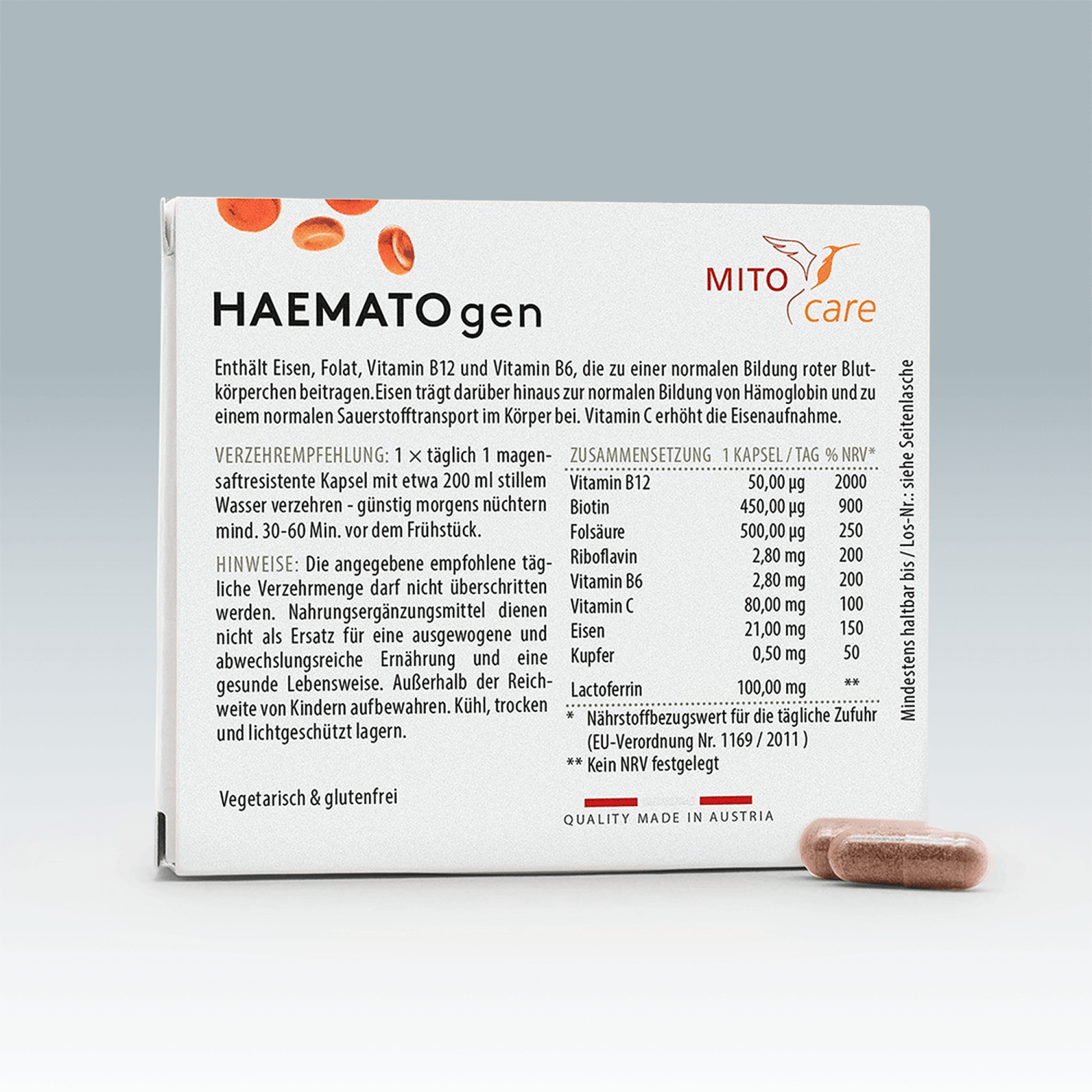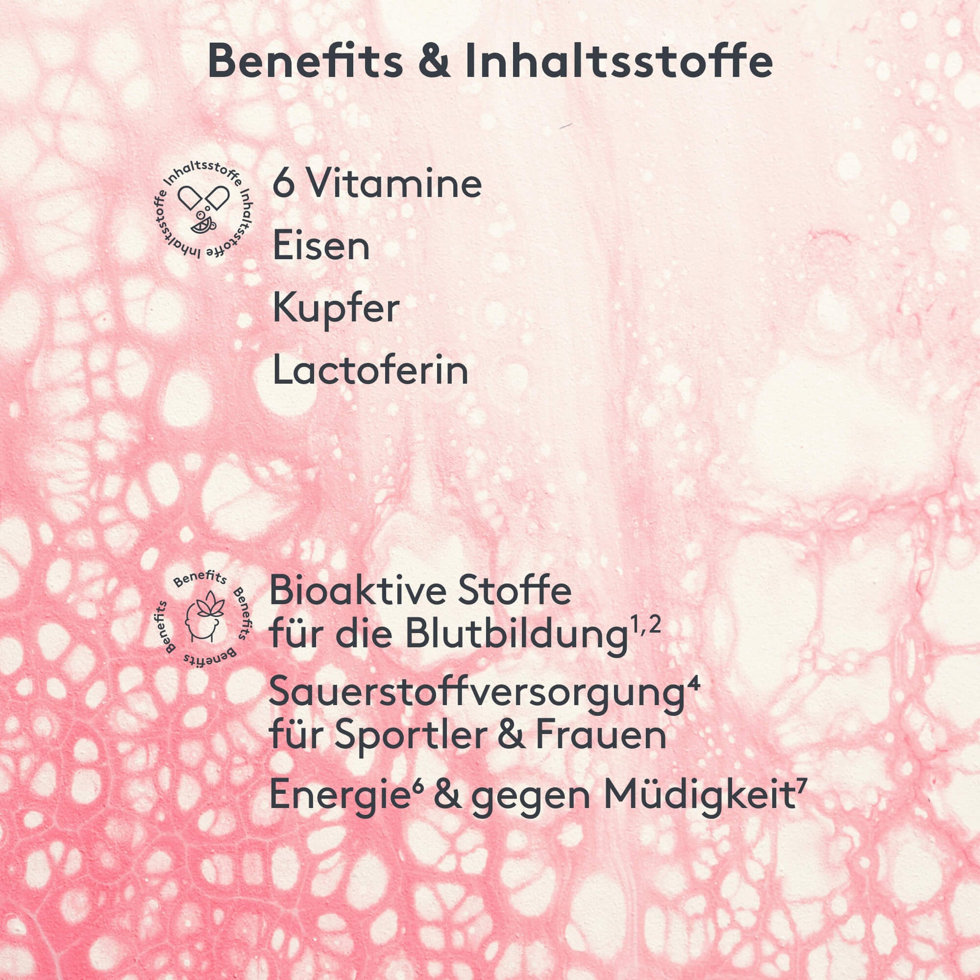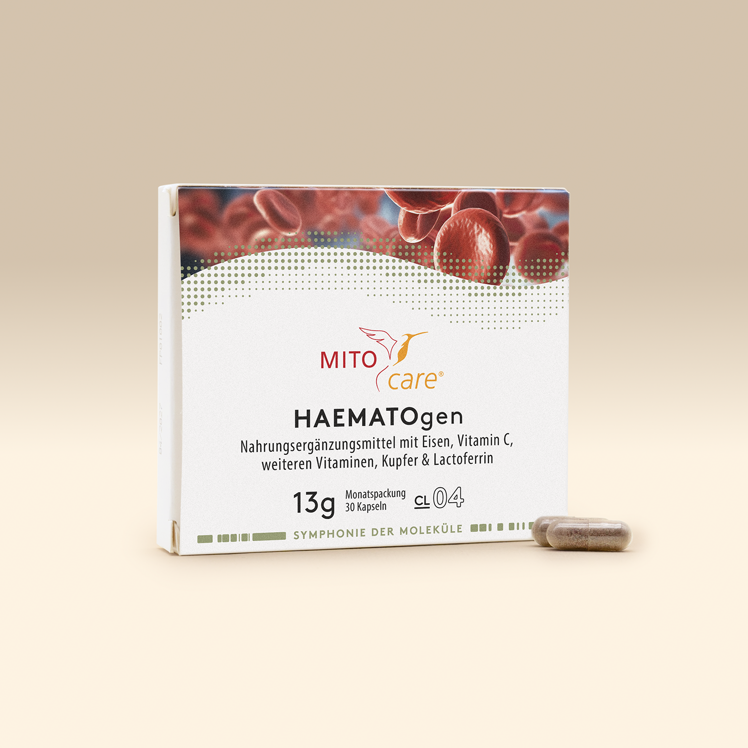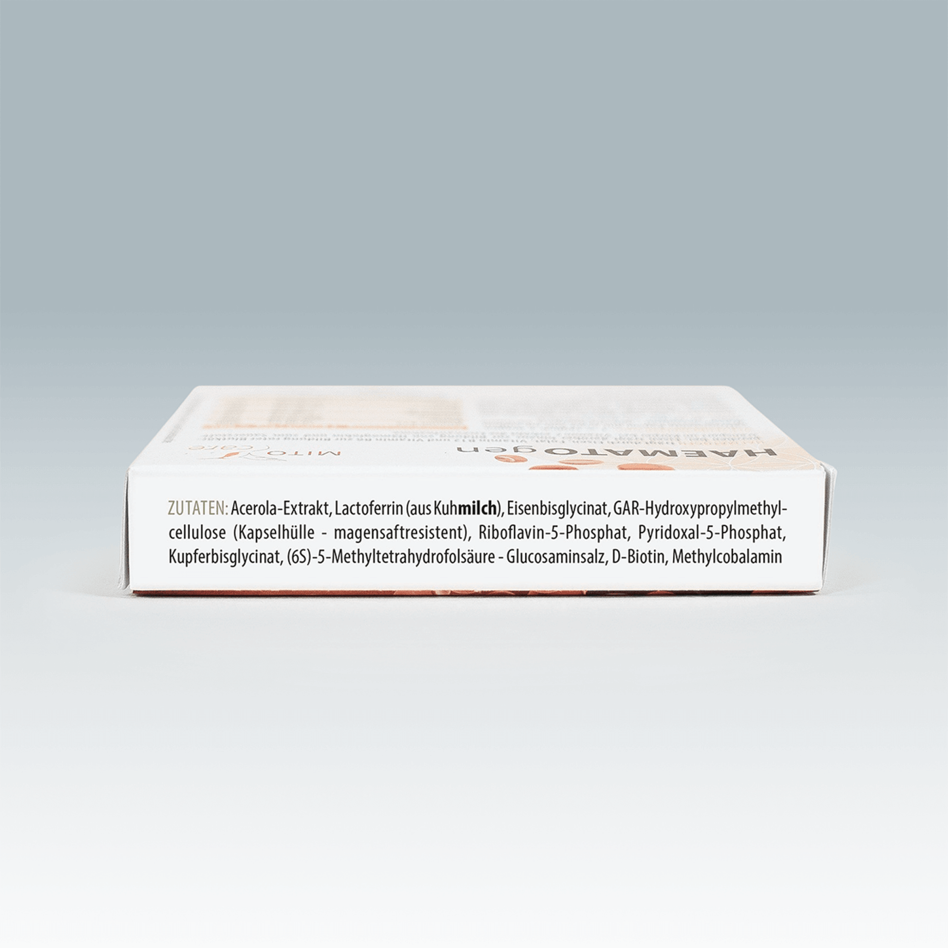 HAEMATOgen contains iron in chelatted shape as iron bisglycinate, which facilitates the absorption in the body as an organic compound. Also included are natural vitamin C for a good iron uptake5 and copper for a healthy iron transport in the body9. Particularly noteworthy in addition to the use of purely bioactive B vitamins is still the use of valuable lactoferrin, which, among other things, acts as iron transport protein and binds free iron in the body.