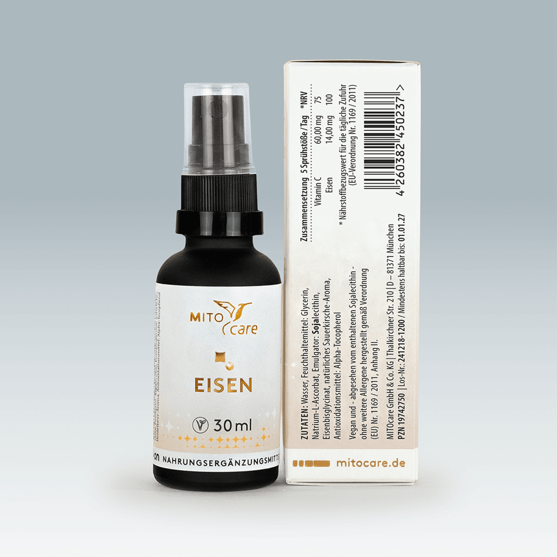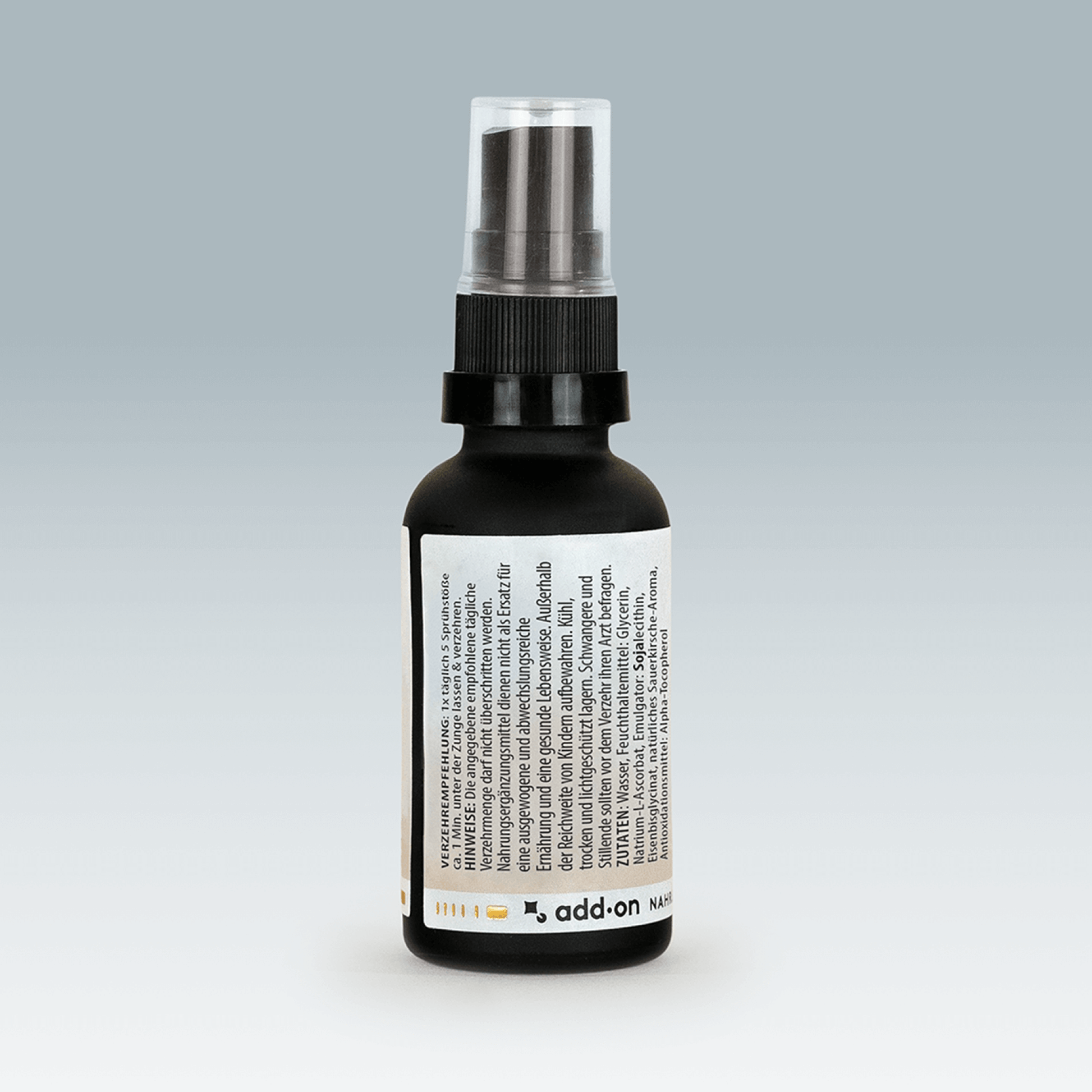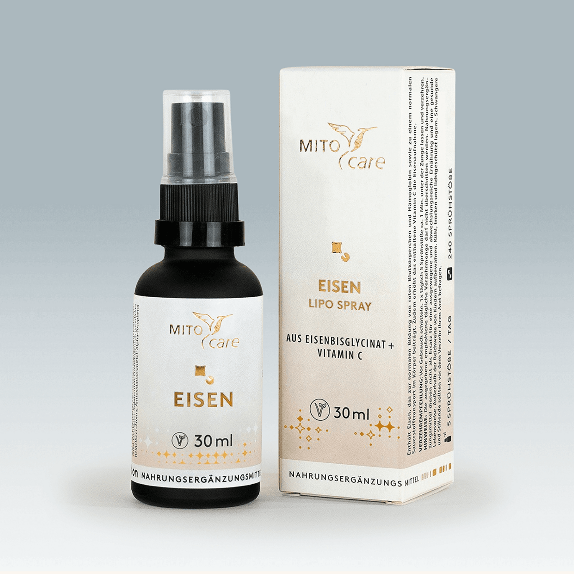 Our MITOcare add·on Iron LIPO Spray contains the essential trace element in the form of the popular iron bisglycinate. In this chelated form, iron is bound to two glycine molecules, increasing bioavailability. Iron is supplemented by vitamin C, which also increases iron absorption3. In addition, the particles of our LIPO spray are microscopically small, which means that absorption begins via the oral mucosa. The effect therefore occurs more quickly. These factors make the spray a smart and bioavailable companion.