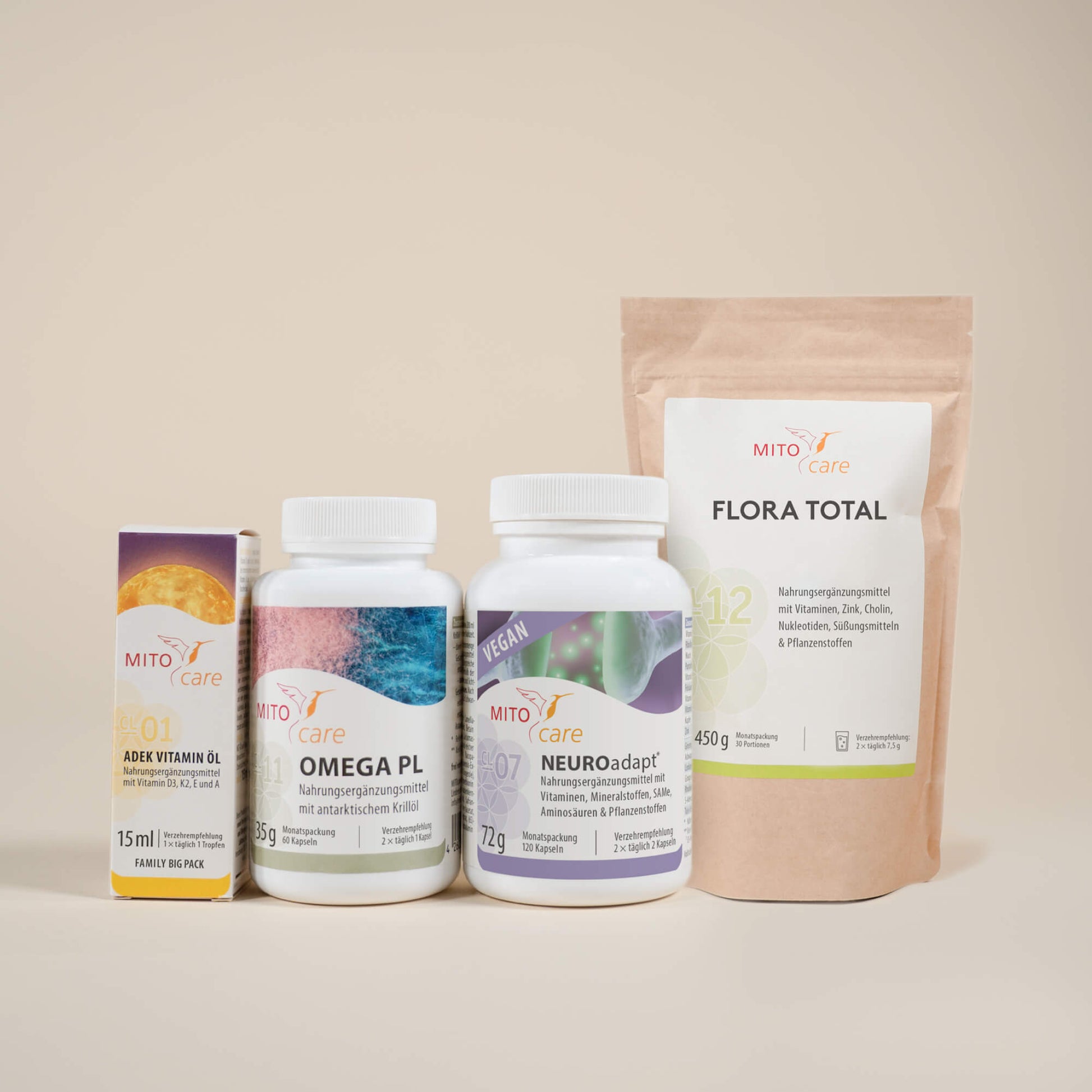 Package of 1x ADEK Vitamin Oil, 1x Omega PL, 1x NEUROadapt** and 1x Flora Total