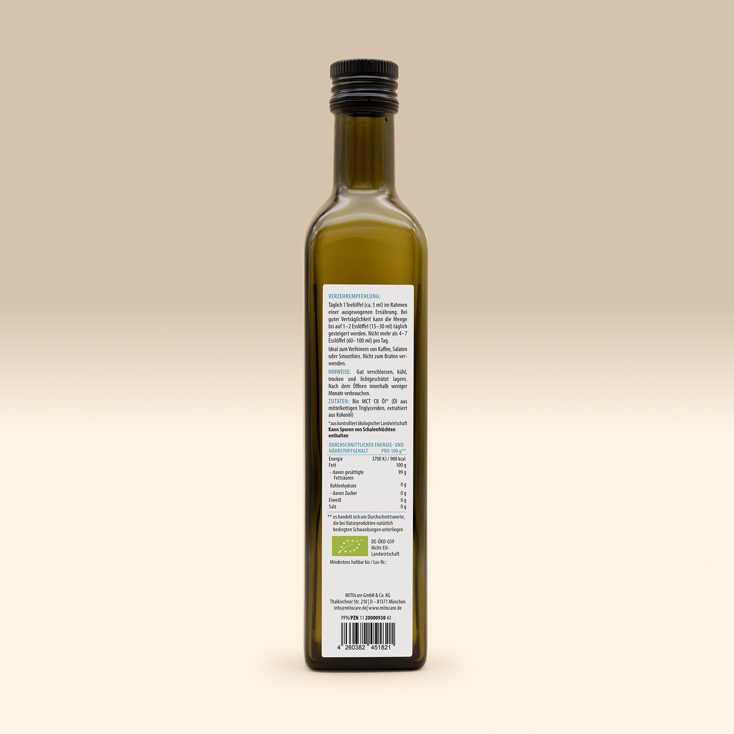 Due to its neutral taste and odor, our organic MCT C8 oil mixes perfectly with coffee or water and is ideal for smoothies, juices, shakes, or salad dressings. However, when heated, MCT oil can develop a sharp or bitter taste, which is why it should not be used for frying, deep-frying, or heating.