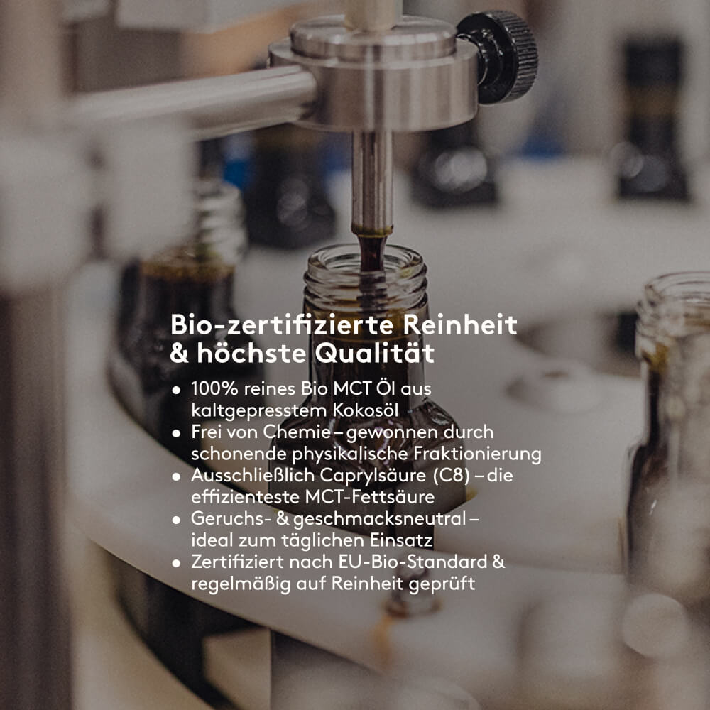 Our organic MCT C8 oil is obtained from carefully pressed organic coconut oil. A gentle physical fractionation process is used, completely without chemical additives. This extracts the high-quality caprylic acid (C8) as a pure, medium-chain fatty acid of the highest organic quality.