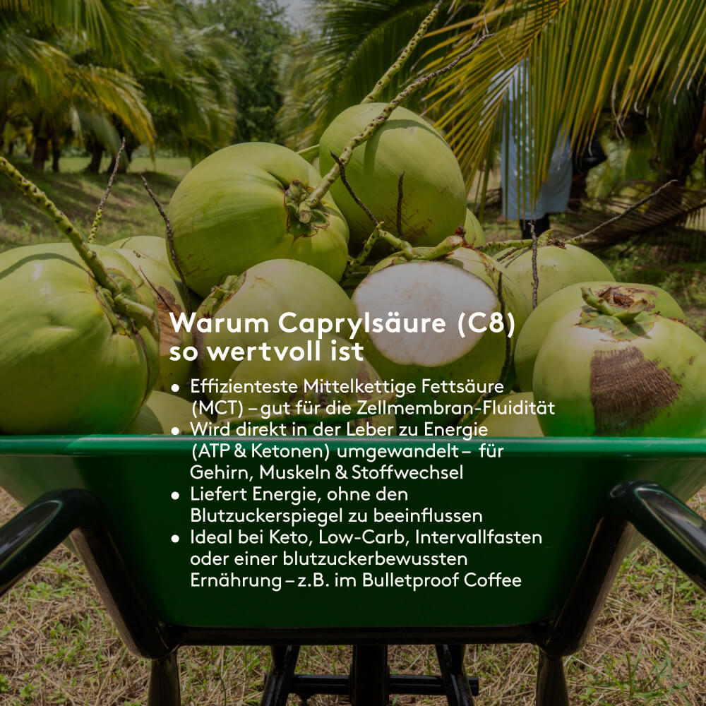 Fast absorption and utilization in the liver due to medium-chain caprylic acid (C8)