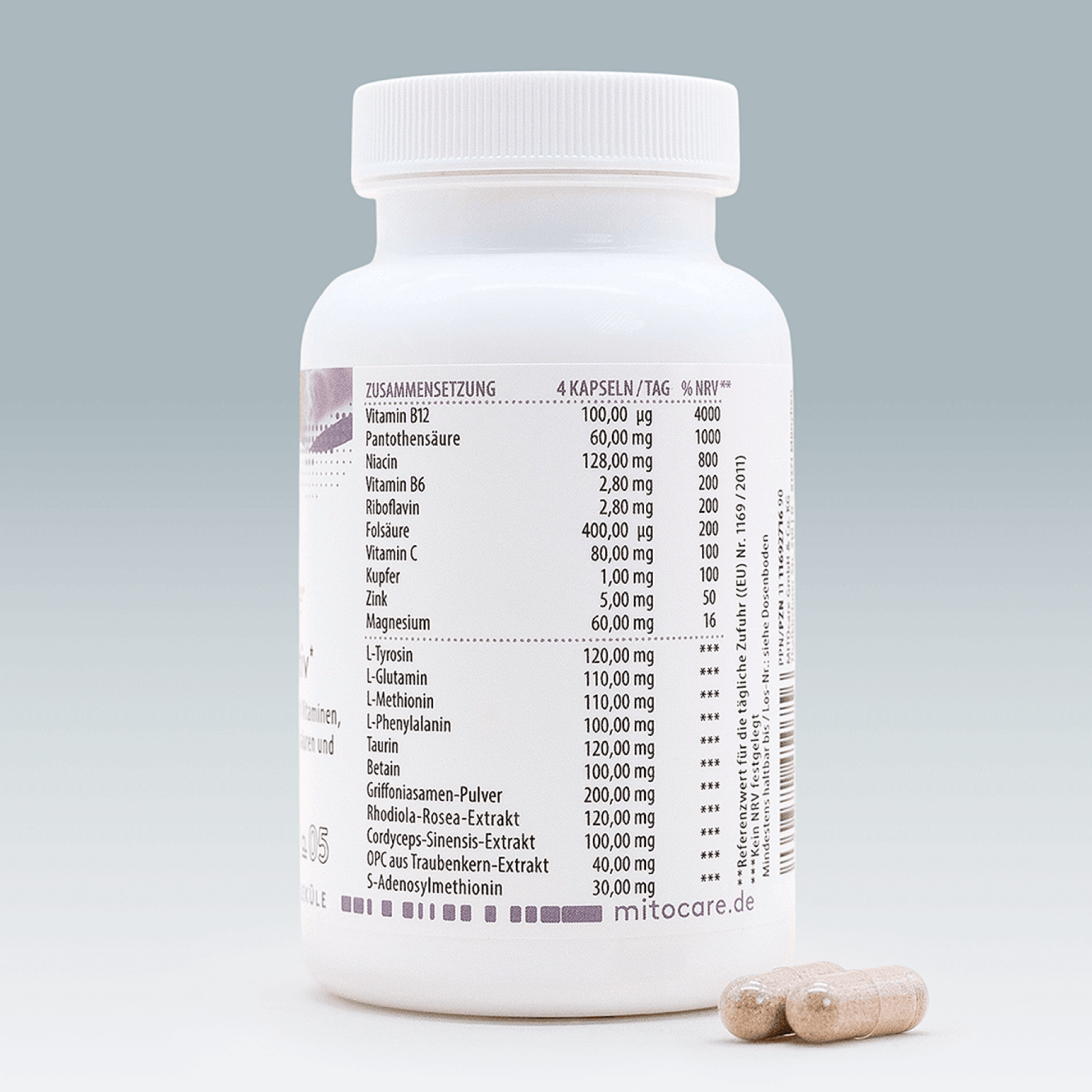 Ingredients: Magnesium bisglycinate, pullulan (capsule shell size 0 ), Griffonia seed powder, betaine hydrochloride, nicotinamide (vitamin B3), L-tyrosine, taurine, Rhodiola rosea extract, L-glutamine, L-methionine, L-phenylalanine, Cordyceps sinensis extract (contains sulphites), vitamin C-rich calcium L-ascorbate, OPC-rich grape seed extract, calcium D-pantothenate, S-adenosyl-L-methionine (SAMe), zinc citrate, pyridoxal-5'-phosphate (vitamin B6), riboflavin-5'-phosphate (vitamin B2), copper citrate, (6S)-5-methyltetrahydrofolic acid - glucosamine salt (5-MTHF), methylcobalamin (vitamin B12)