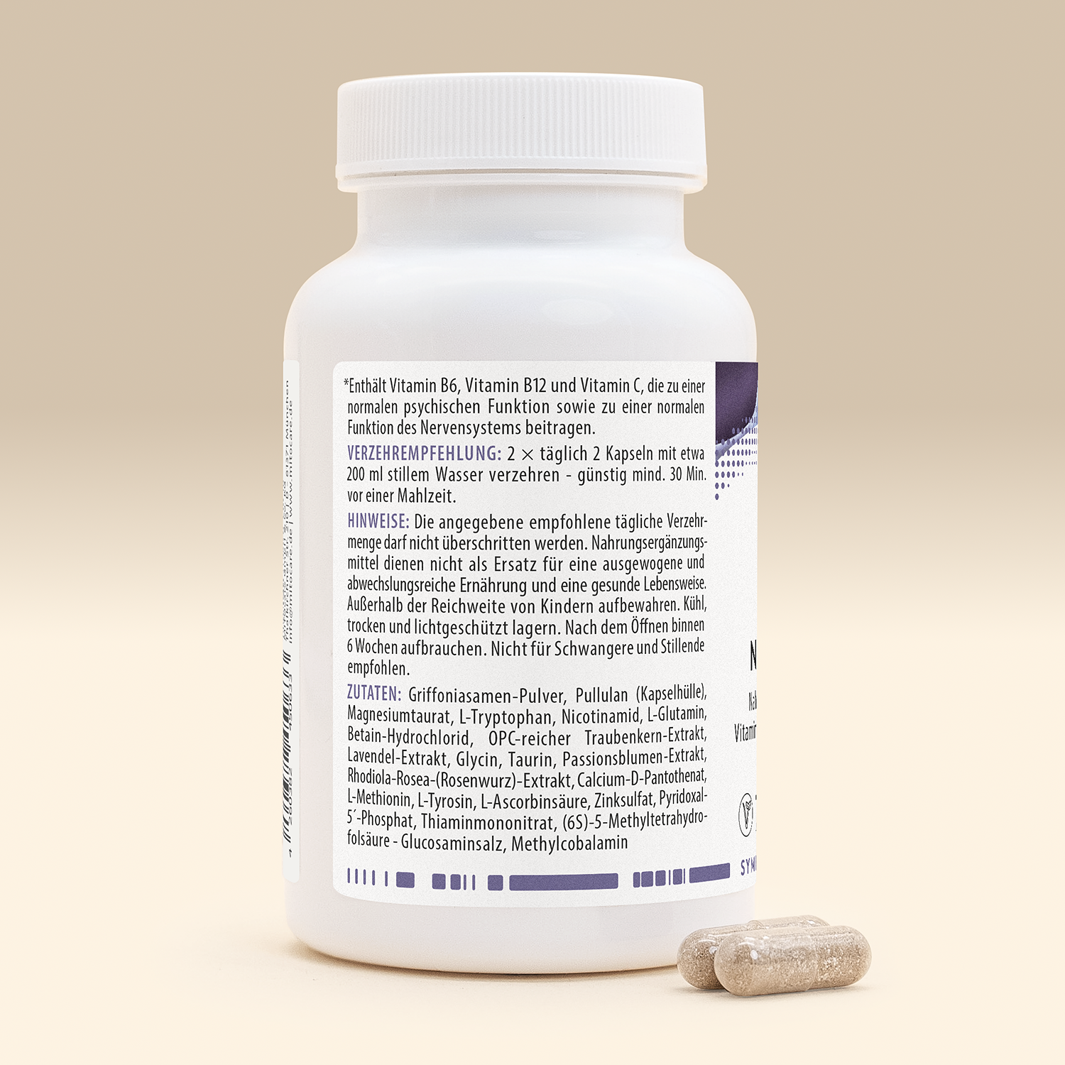 For our NEUROtonin* we only use valuable nutrient and plant compounds – packed into a vegan capsule shell of Pullulan. As a conscious choice, we refrain from using any unnecessary fillers and additives.