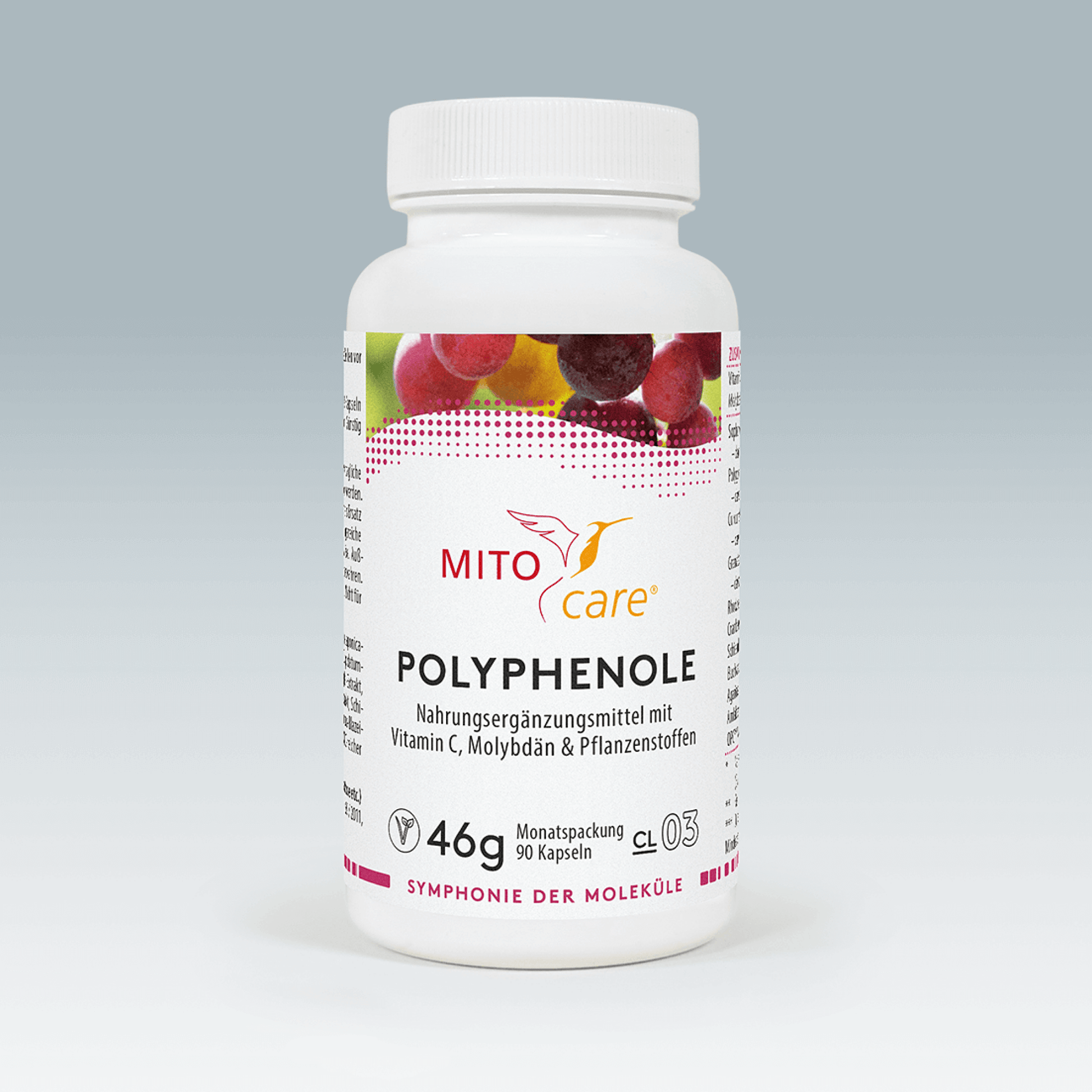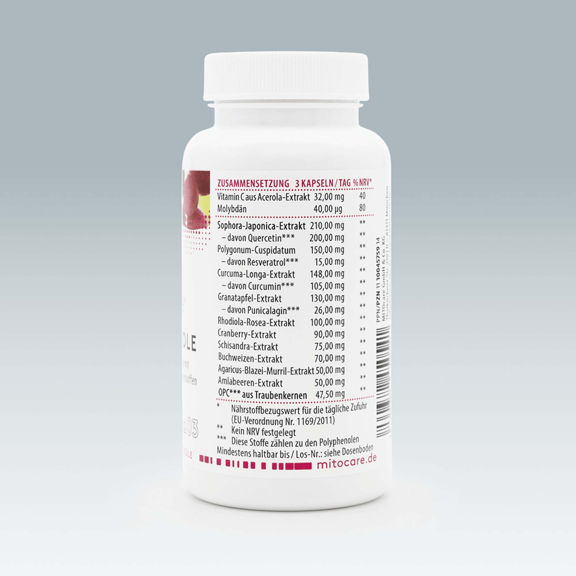 Polyphenols combines 12 valuable phyto-chemicals such as curcuma (turmeric), schisandra, OPC, ginger, amla berries, pomegranate etc. and supports the immune system with vitamin c3. The trace element molybdenum contained in the product contributes to the metabolism of sulphur-containing amino acids.4 The Western diet and contact with chemicals can be the reason for an increased need here.