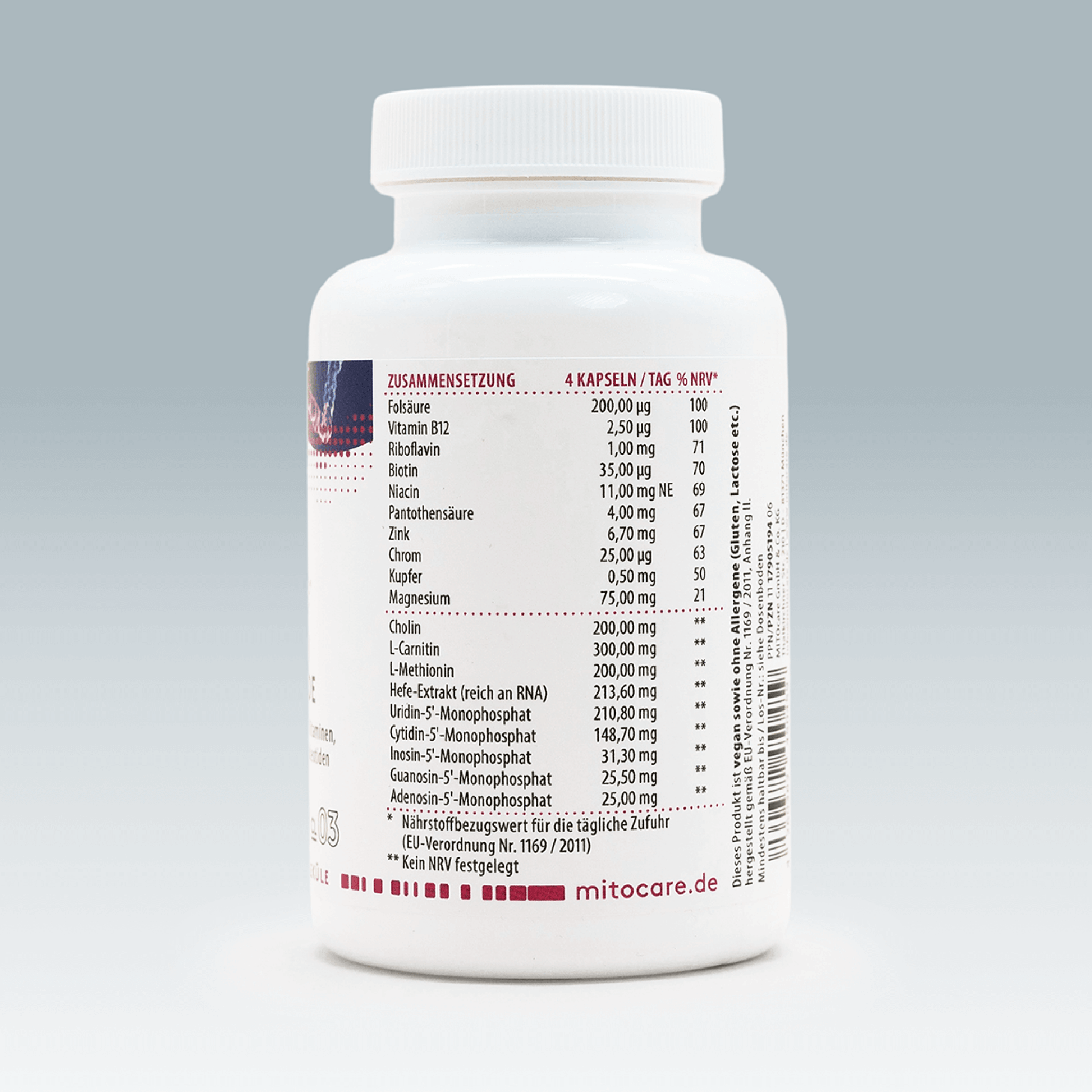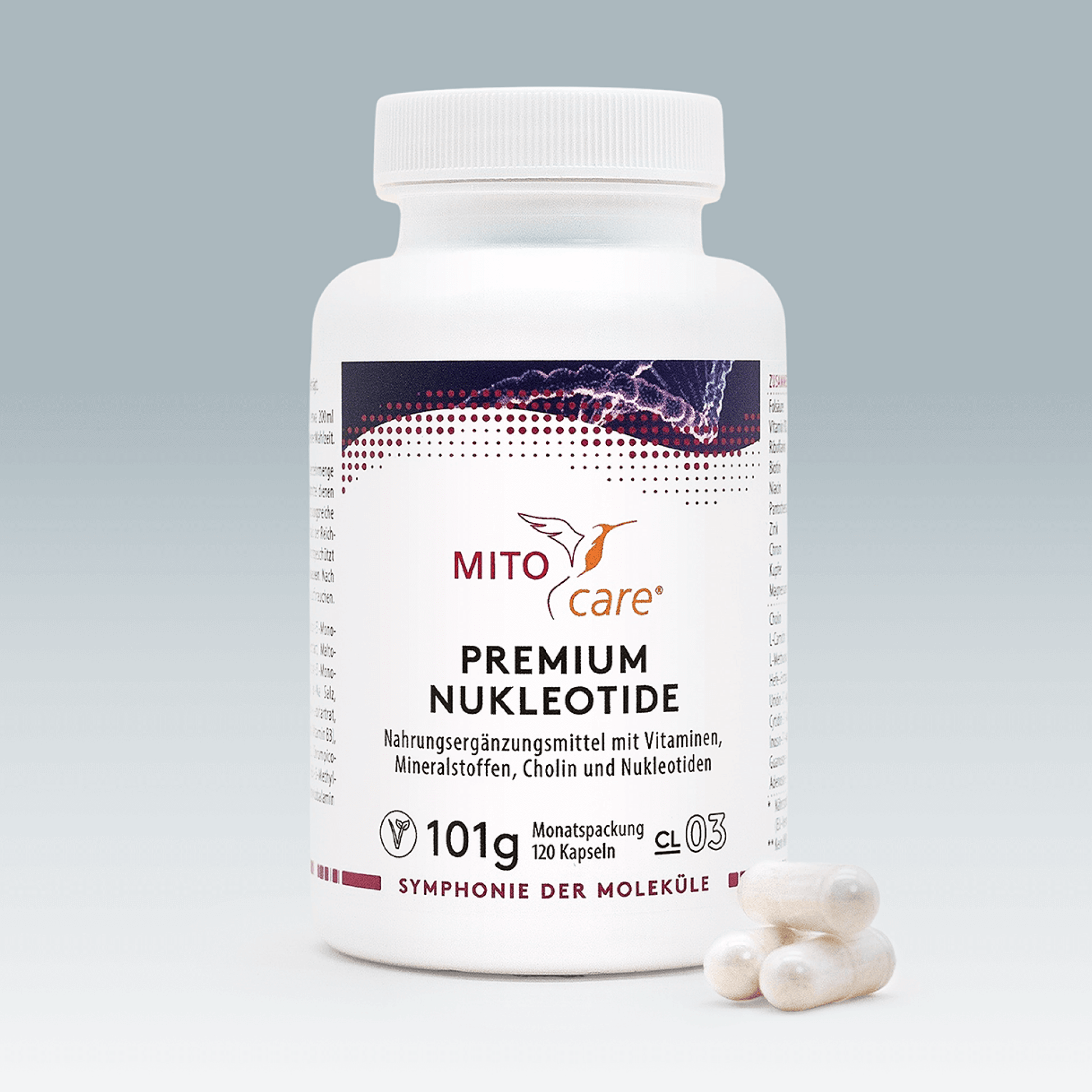 The product Premium Nucleotide contains all 5 approved nucleotides. Magnesium, zinc, vitamin B12 (methylcobalamin) and the bioactive folic acid compound are also involved in the cell division described above2. Zinc also contributes to DNA synthesis1. Thanks to various B vitamins and magnesium, this product helps to reduce tiredness and fatigue4, supports the function of the nervous system5 and also has a positive effect on hair and skin.6