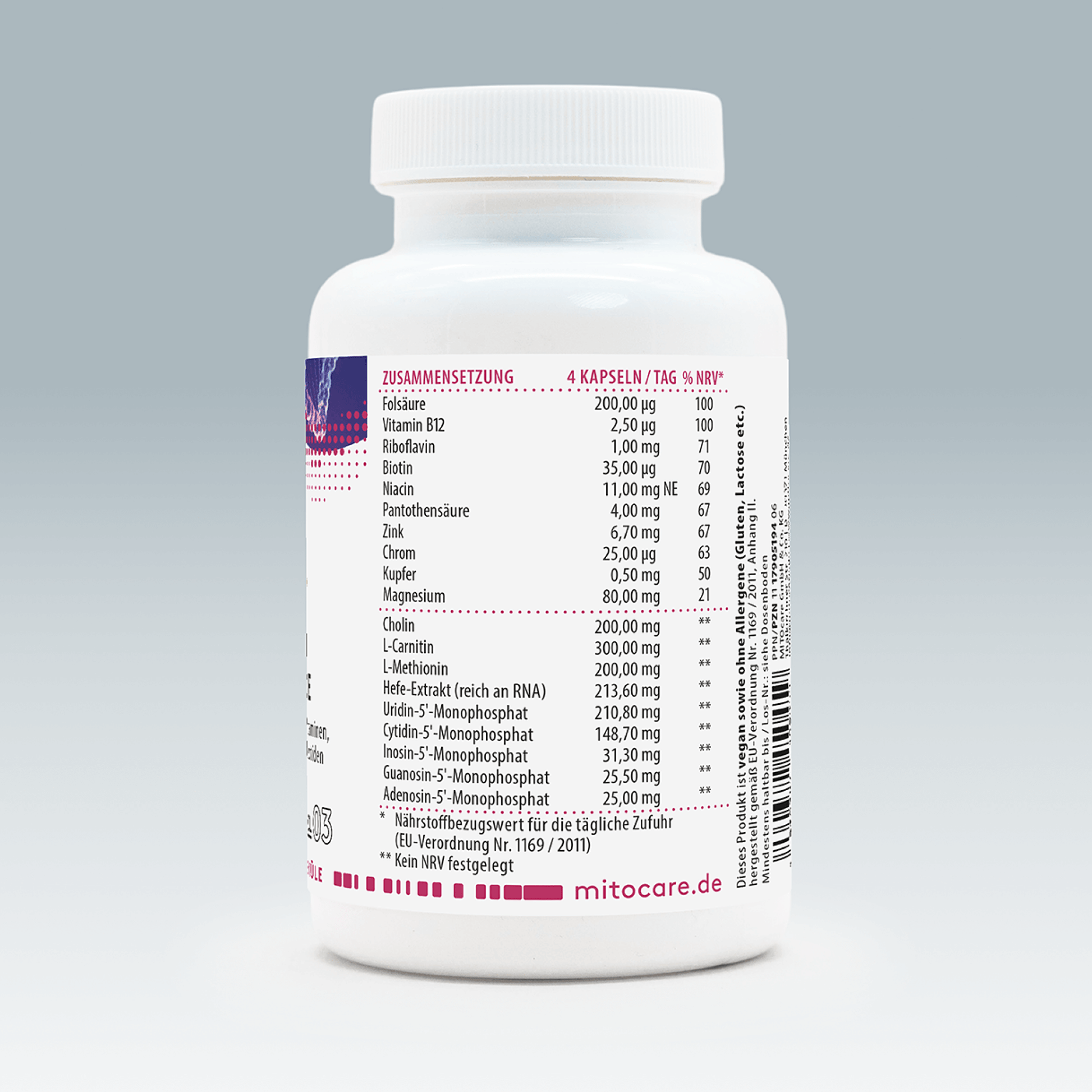 Nucleotides are the building blocks of DNA and RNA. The product Premium Nucleotides contains all 5 authorised nucleotides. Magnesium, zinc, vitamin B12 (methylcobalamin) and the bioactive folic acid compound are key players in this cell division.2