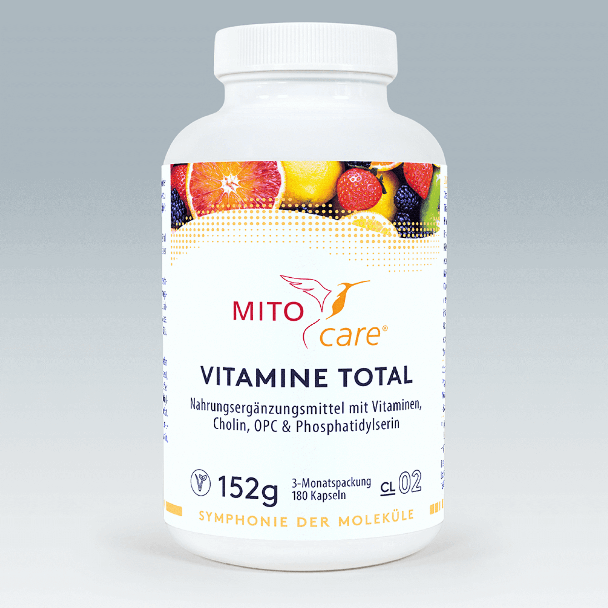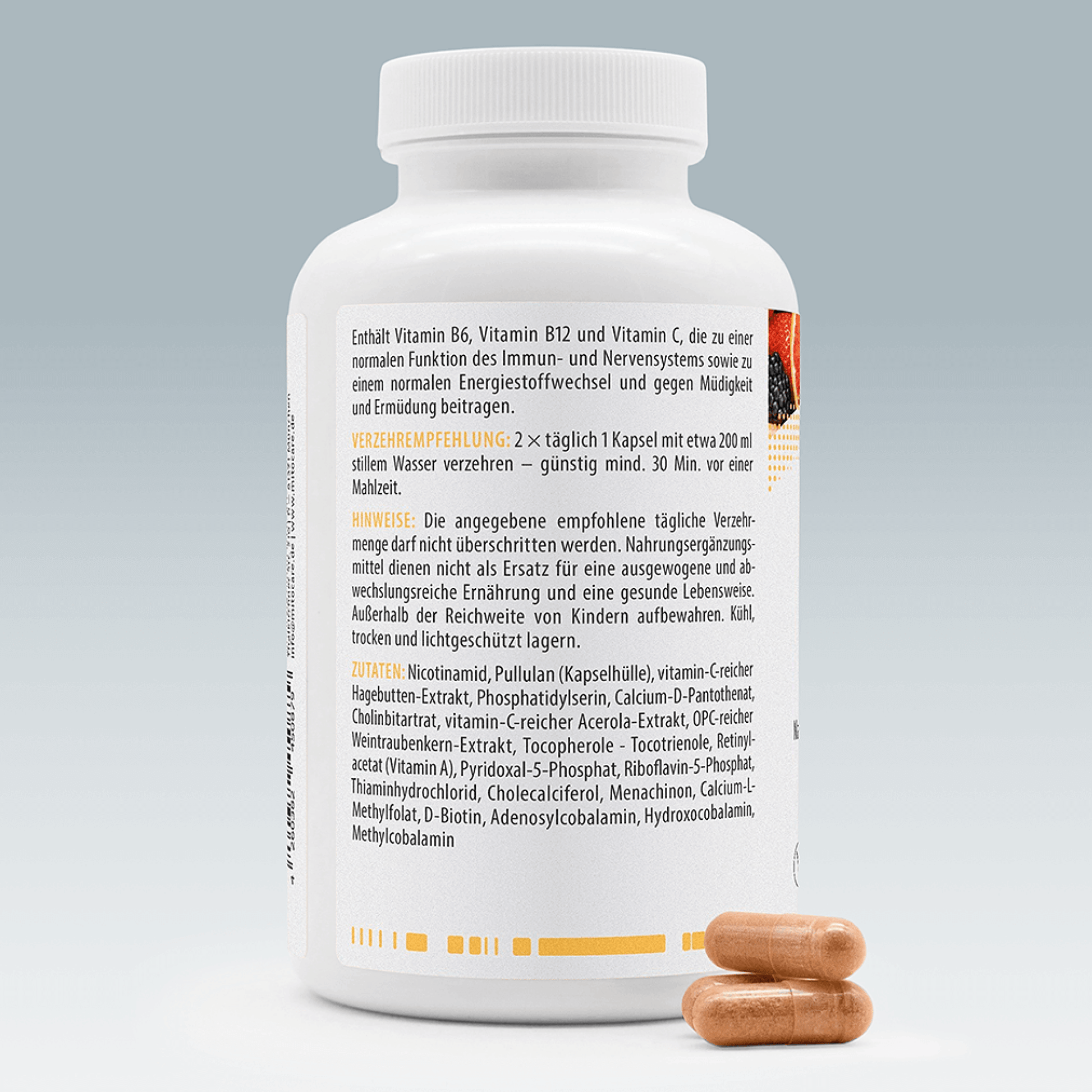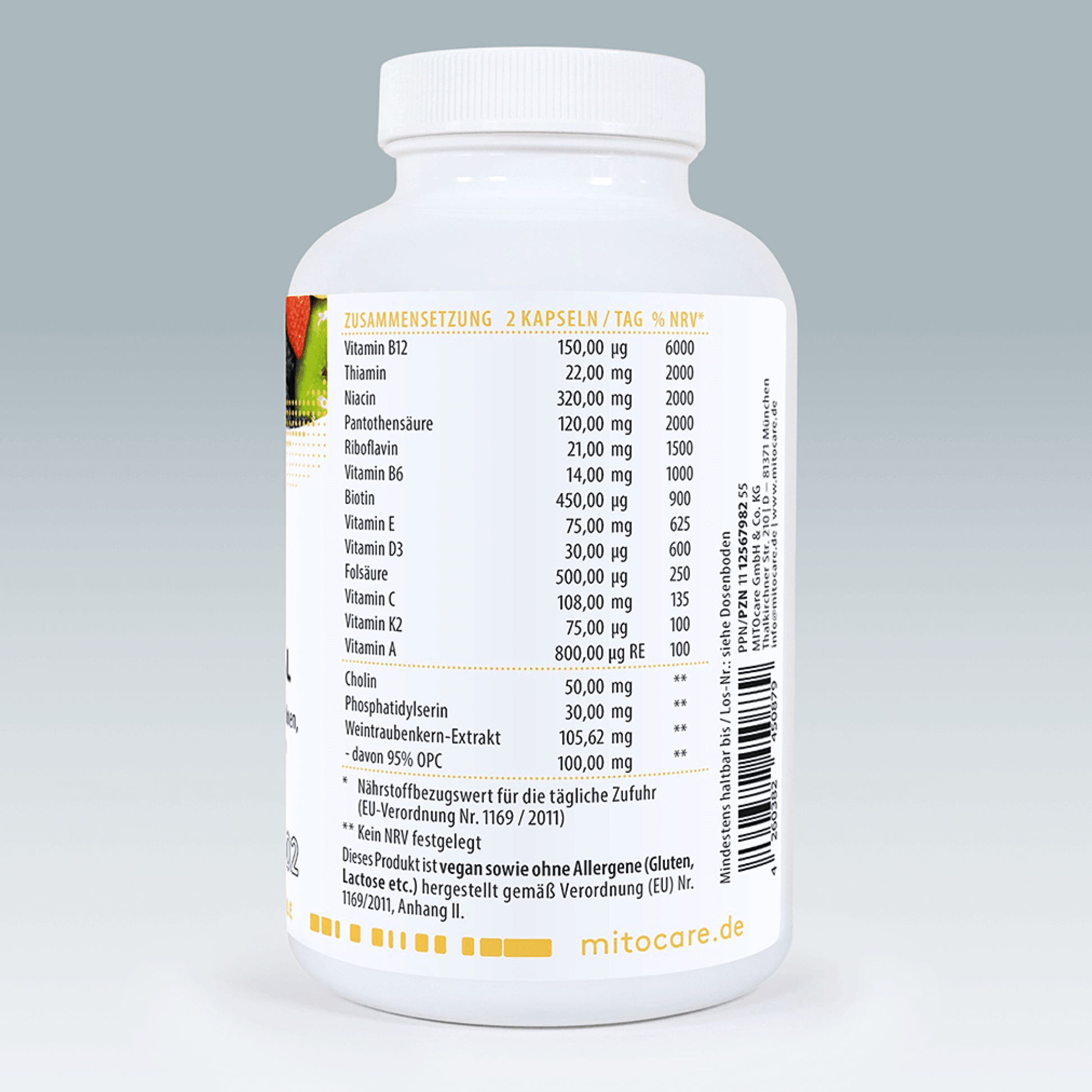 Ingredients: Nicotinamide (vitamin B3), pullulan (capsule shell size 00), vitamin C-rich rosehip extract, phosphatidylserine, calcium D-pantothenate, choline bitartrate, vitamin C-rich acerola extract, OPC-rich grape seed extract, tocopherols - tocotrienols (contains vitamin E), retinyl acetate (vitamin A), pyridoxal-5-phosphate (vitamin B6), riboflavin-5-phosphate (vitamin B2), thiamine hydrochloride (vitamin B1), cholecalciferol (vitamin D3), menaquinone (vitamin K2 - MK7-all-trans), calcium L-methylfolate, D-biotin, adenosylcobalamin, hydroxocobalamin