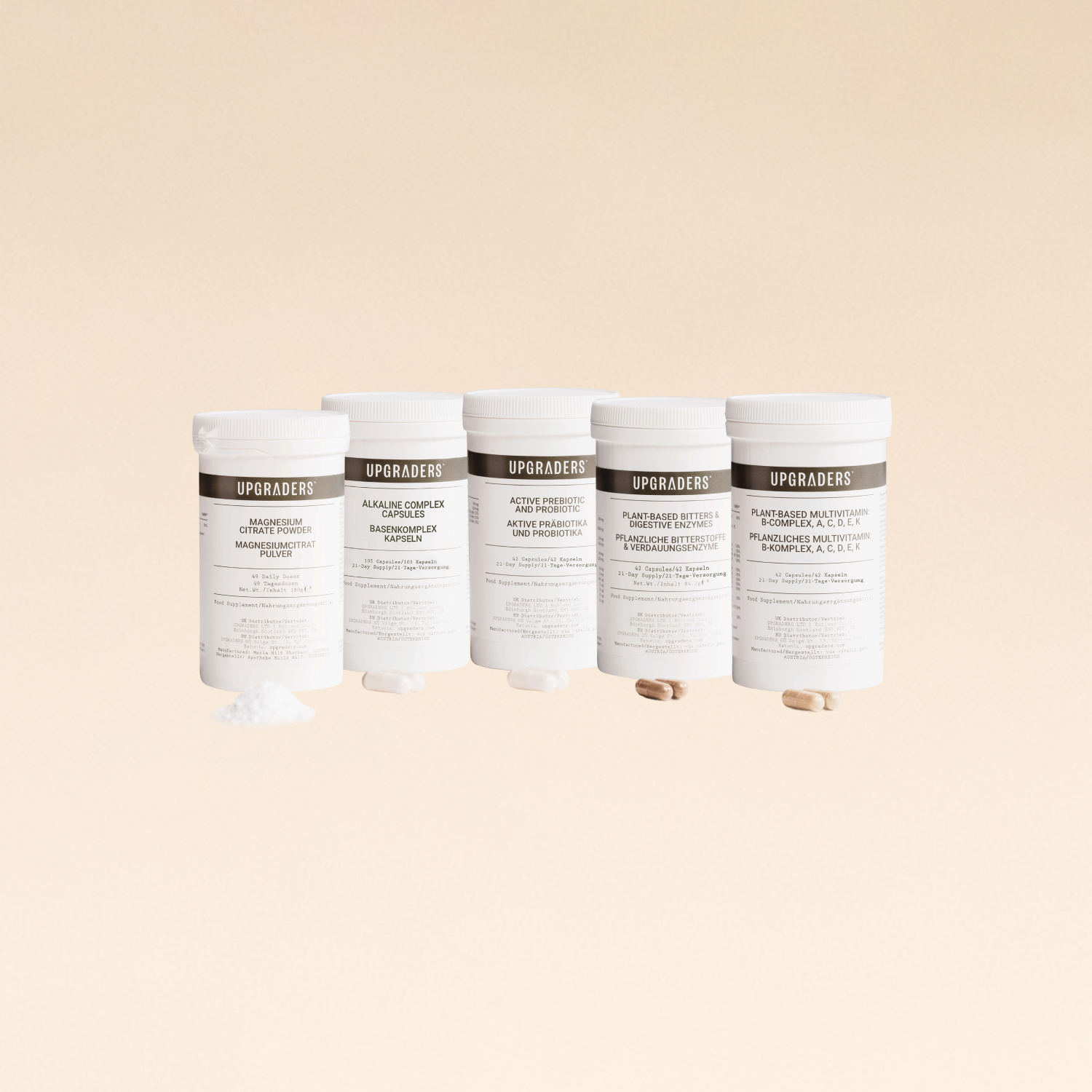 The Upgraders® Kit is a unique 21-day at-home program featuring five powerful, 100% natural, synergistic supplement blends, expertly crafted in the Alps by world-renowned microbiome expert Dr. Henning Sartor, PhD, designed to restore metabolic balance and revitalize cellular health.