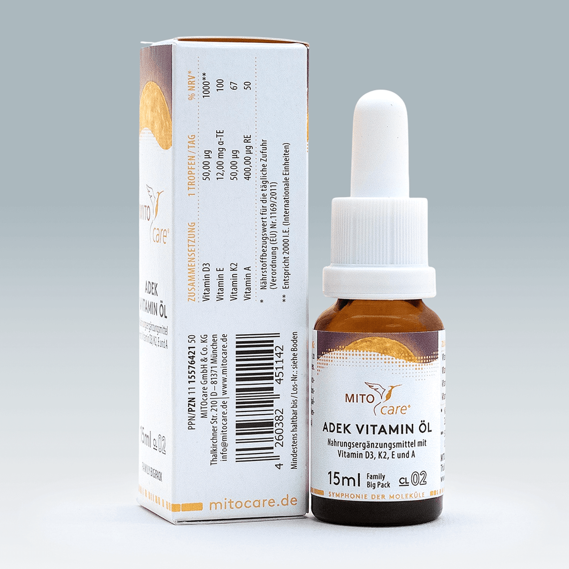 Zutaten: D-Alpha-Tocopherol (Vitamin E), MCT-Öl auf Kokosbasis, Olivenöl, Retinylpalmitat, Cholecalciferol (Vitamin D3), Menachinon (Vitamin K2 - MK7 all-trans)