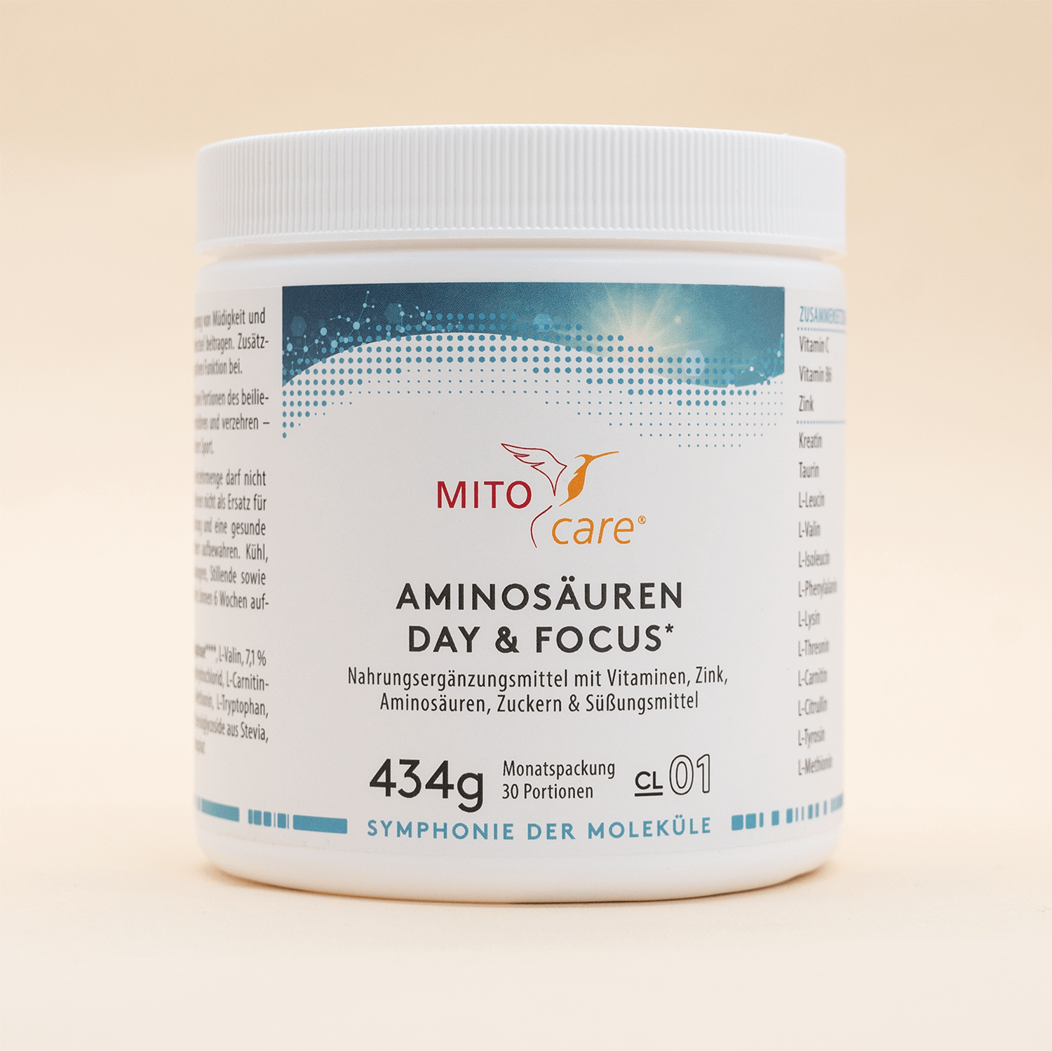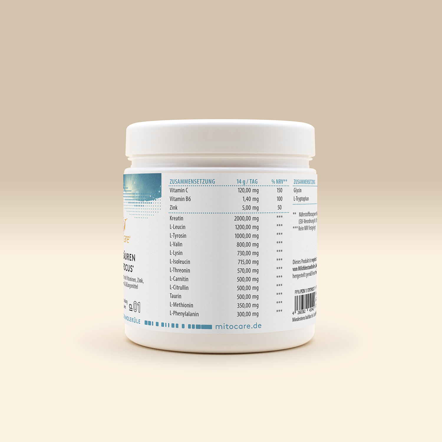 Unser MITOcare Aminosäuren Day & Focus* versorgt dich mit nur einem Messlöffel täglich mit 12 hochwertigen Aminosäuren sowie Taurin und Kreatin, die durch die Ergänzung von Vitamin B6, Vitamin C & Zink gut vom Körper aufgenommen werden können.