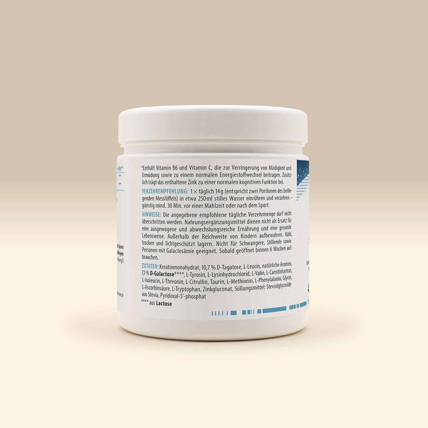 Zutaten: Kreatinmonohydrat, 10,7 % D-Tagatose, L-Leucin, natürliche Aromen, 7,1 % D-Galactose (aus Lactose), L-Tyrosin, L-Lysinhydrochlorid, L-Valin, L-Carnitintartrat, L-Isoleucin, L-Threonin, L-Citrullin, Taurin, L-Methionin, L-Phenylalanin, Glycin, L-Ascorbinsäure, L-Tryptophan, Zinkgluconat, Süßungsmittel: Steviolglycoside aus Stevia, Pyridoxal-5‘-phosphat
