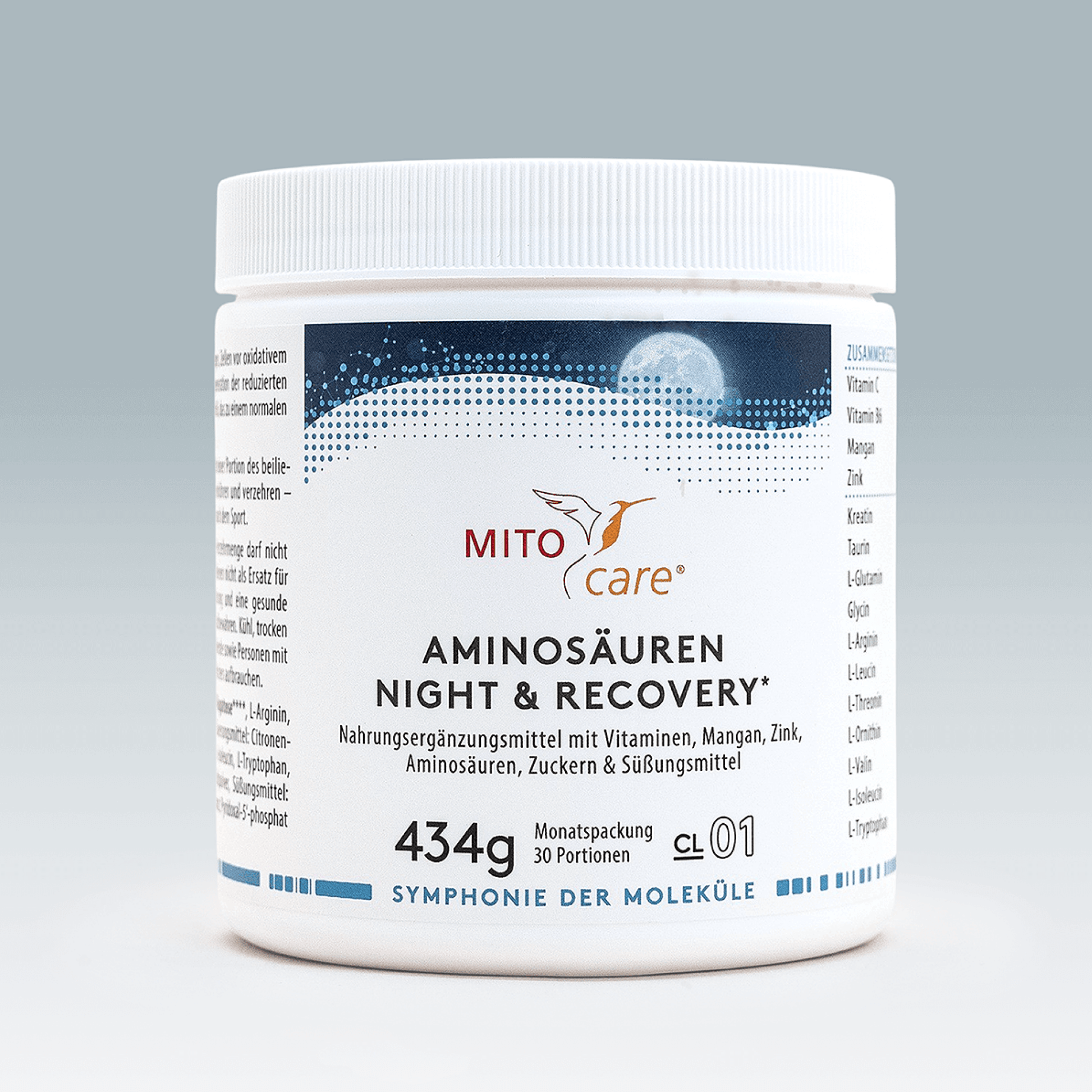 Das Produkt Aminosäuren Night & Recovery* ist eine ausgewogene Mischung aus 9 Aminosäuren, Taurin und Kreatin sowie Vitaminen, Mangan und Zink. Das enthaltene Vitamin C unterstützt den Zellschutz vor oxidativem Stress1,2 sowie die gesunde Kollagenbildung3 - auch im Schlaf. Vitamin B6 trägt zu einem intakten Eiweißstoffwechsel4 und zu einem ausgeglichenen Hormonhaushalt5 bei. Zudem leistet Zink einen Beitrag zu einem gesunden Kohlenhydrat6-, Fettsäure7- und Säure-Basen-Stoffwechsel8 sowie zur normalen DNA-Synthese9.