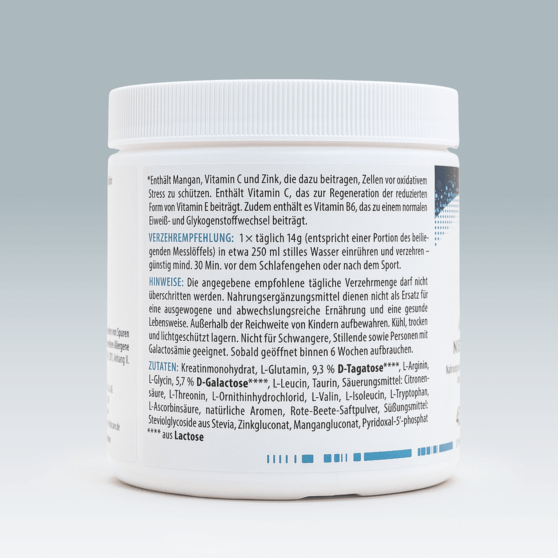 Zutaten: Kreatinmonohydrat, L-Glutamin, D-Tagatose, D-Galactose***, L-Arginin, L-Glycin, L-Leucin, Taurin, Säuerungsmittel: Citronensäure, L-Threonin, L-Ornithinhydrochlorid, L-Valin, L-Isoleucin, L-Tryptophan, L-Ascorbinsäure, natürliche Aromen, Rote Beete-Saftpulver, Süßungsmittel: Steviolglycoside, Zinkgluconat, Mangangluconat, Pyridoxal-5'-phosphat