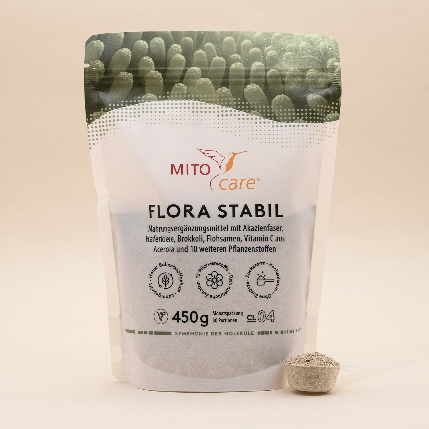 Unser Produkt Bio Flora Stabil ist ein sorgfältig zusammengestellter veganer Ballaststoff-Komplex mit 14 Pflanzenstoffen aus kontrolliert ökologischer Landwirtschaft. Das enthaltene Vitamin C trägt zu einem intakten Immunsystem1 sowie zu einem gesunden Energiestoffwechsel2 bei.